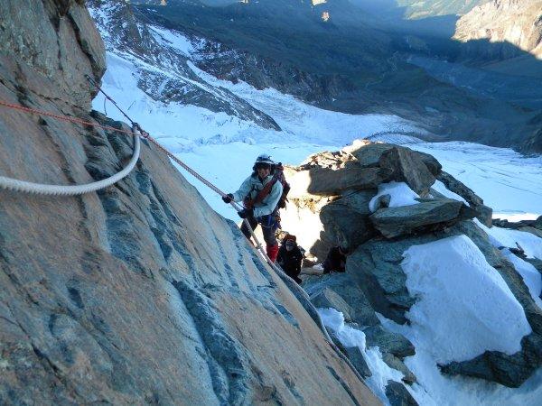 La traccia presente per raggiungere il Rossi e Volante è quella che procede in basso verso il Polluce, poi dopo lo sperone roccioso del bivacco c’è la deviazione verso sx per la Roccia Nera (Canalino nevoso con corda fissa non molto affidabile).