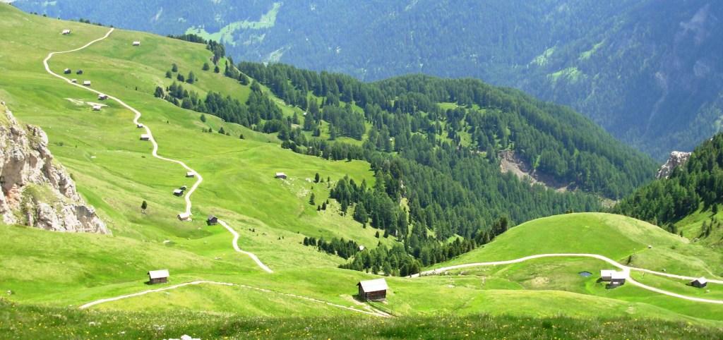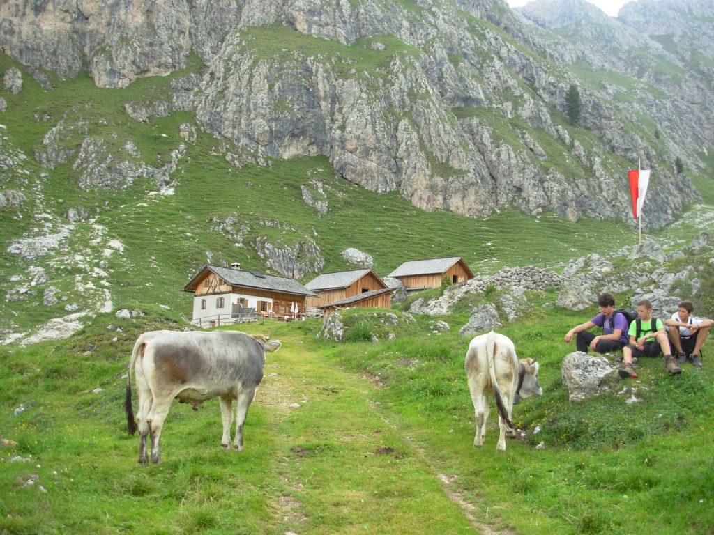 Si prosegue lungo il tracciato principale che conduce poi fino alla Malga Gampen – Gampenalm che si lascia alla propria sx per seguire sempre la sterrata principale che con due tornanti ed un traverso verso sx supera la barriera rocciosa dei Bronsoi e raggiunge l’avvallamento in cui sorge il Rif. Genova-Schluterhutte (2297 m).