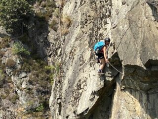 Le condizioni della guaina che ricopre il cavo di sicurezza non sono perfette ma solo a causa delle intemperie visto che la parete è sempre esposta al sole. Grazie alle indicazioni di alcuni utenti ho portato una lounge in più per i punti più impegnativi e devo ammettere che senza sarebbe stato davvero difficile. Le due vie sono abbastanza simili con la differenza che quella più impegnativa è più tecnica e soprattutto atletica. Le strade si uniscono alla fine del primo tratto, dal secondo c’è un’unica via semplice e panoramica. Nel complesso buone le condizioni, le segnalazioni e il sentiero di ritorno (meglio prendere a sinistra e raggiunta la borgata subito a sinistra).