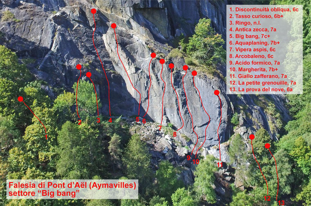 Due settori con stili differenti tra loro: settore *Big bang* (basso) con vie tecniche mediamente appoggiate, settore *Cengia sospesa* (alto) con vie verticali di forza/resistenza su tacche e buchi.