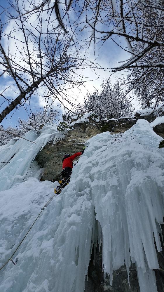 Abbiamo poi avuto la fortuna di poter scalare tre linee (due per me e Fabry) davvero incredibili per verticalità, varietà dei passaggi e qualità del ghiaccio, con Max Piras venuto a sopralluogare la sua “creatura”…