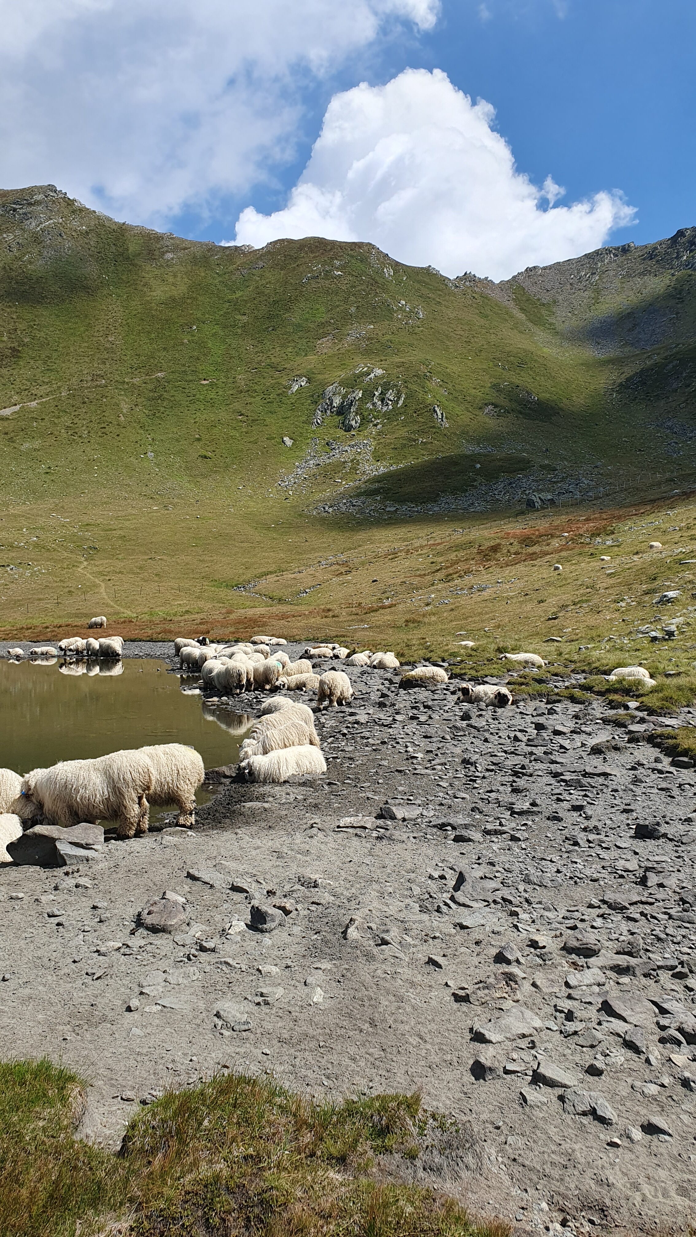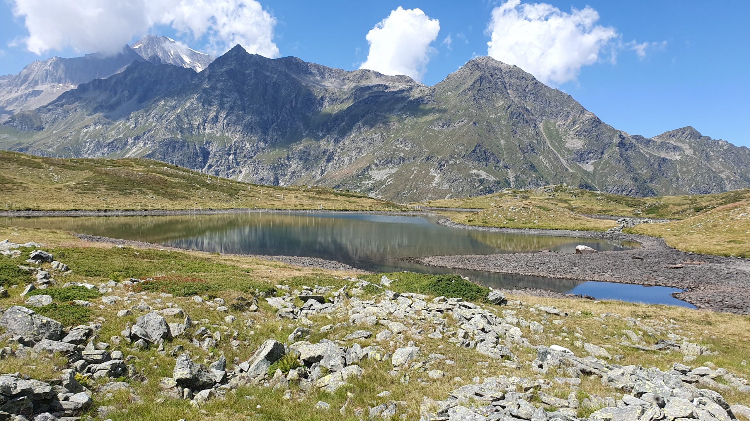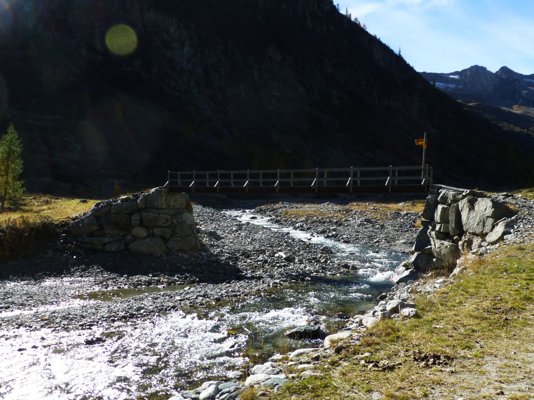 Dopo il lago attraversare il torrente sul ponticello e continuare sul sentiero che dapprima costeggia il fiume e poi sale ripidamente fino all’alpe Pontimia (m. 2190) e infine ai laghi su bei pendii pratosi.