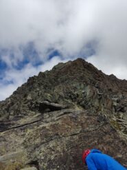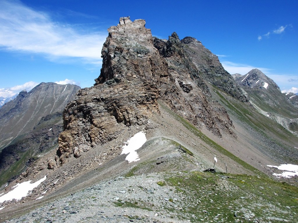 Una volta giunti sulla cresta S/E(come da note) rimanere sul filo della stessa senza bisogno di aggirare le difficoltà che si presentano in quanto si procede su roccia buona, giunti alla base di un muro che pare il tratto finale della salita spostarsi sulla dx tratto esposto ma gradinato e ben appigliato, che conduce sotto una anticima, aggirarla a sx e riguadagnare il filo di cresta che per facili roccette portano sulla vicina cima.