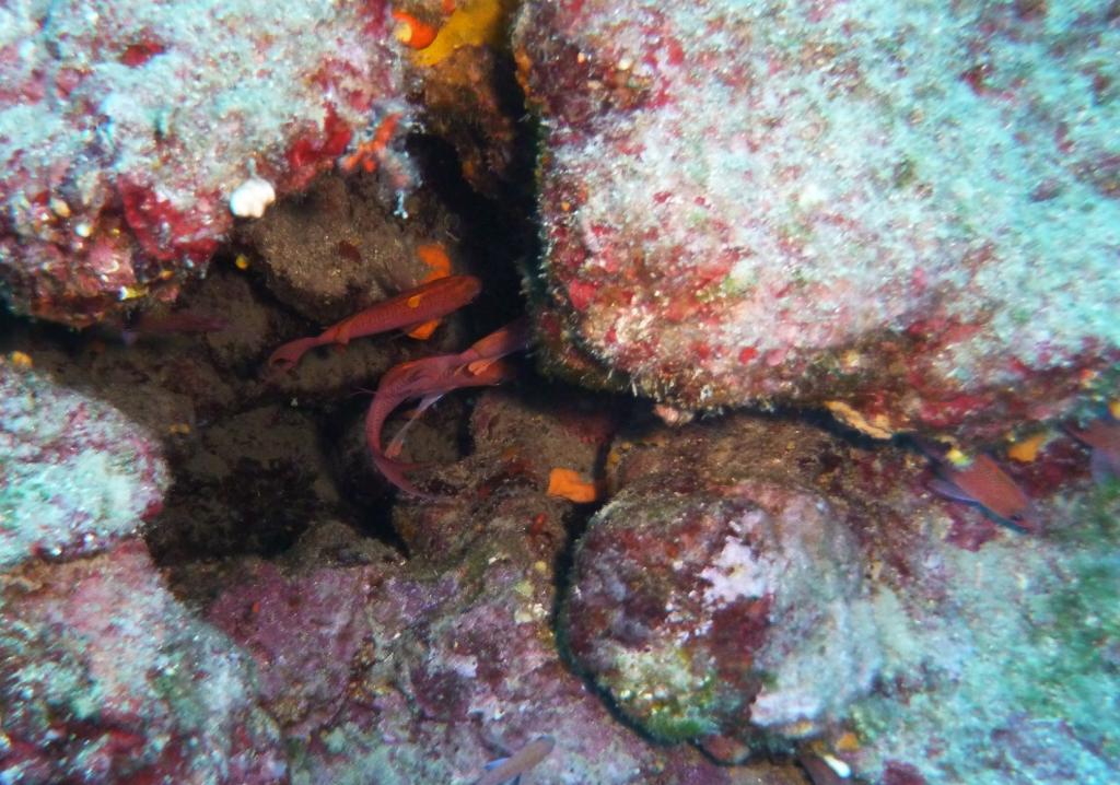 Alla profondità di circa dieci metri la parete è infatti interrotta da ampie fratture orizzontali che formano dei ‘tetti’ profondi qualche metro. Qui, tra tappeti di margherite di mare (parazoanthus axinellae) si rintanano cernie e musdee.