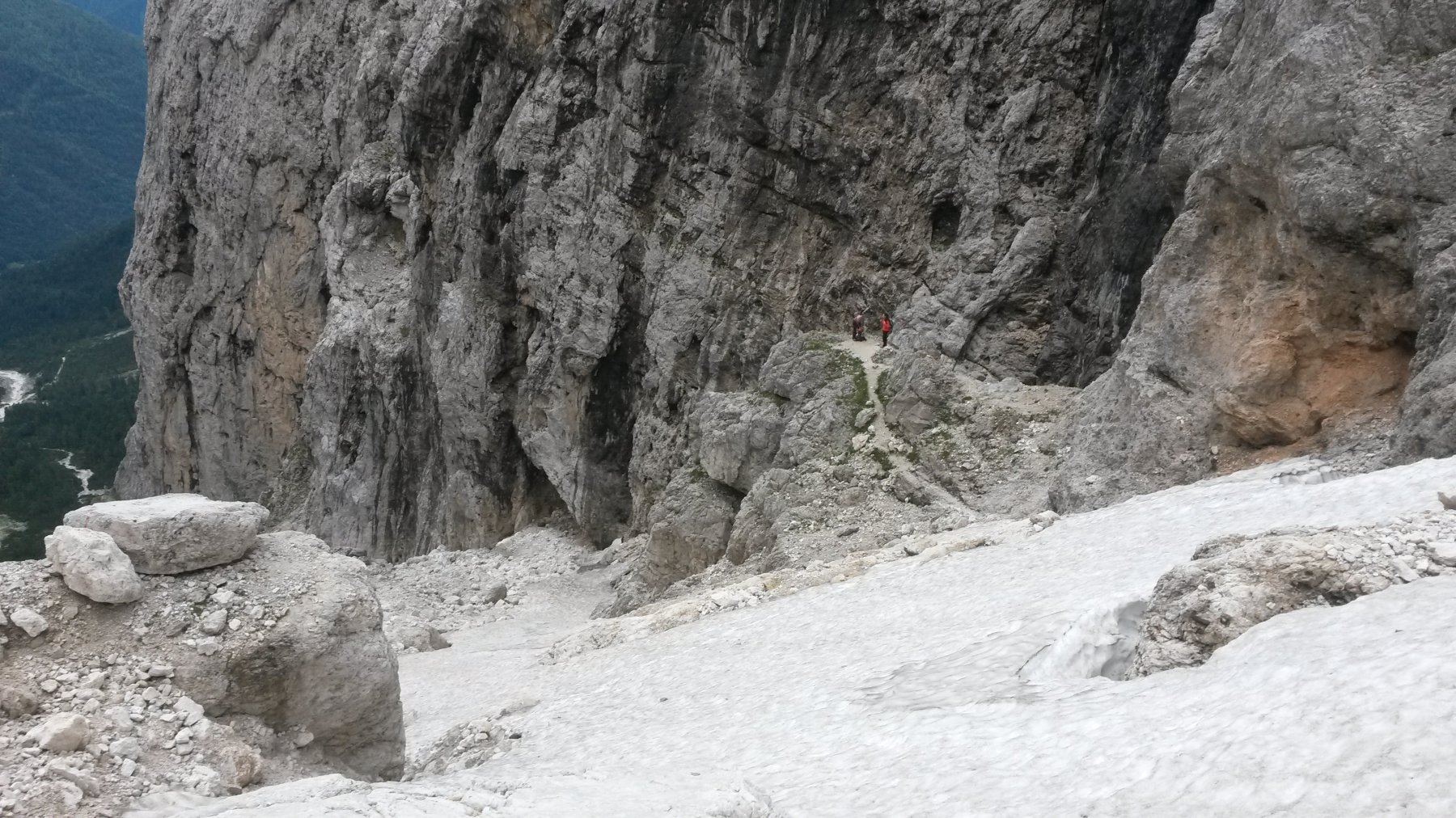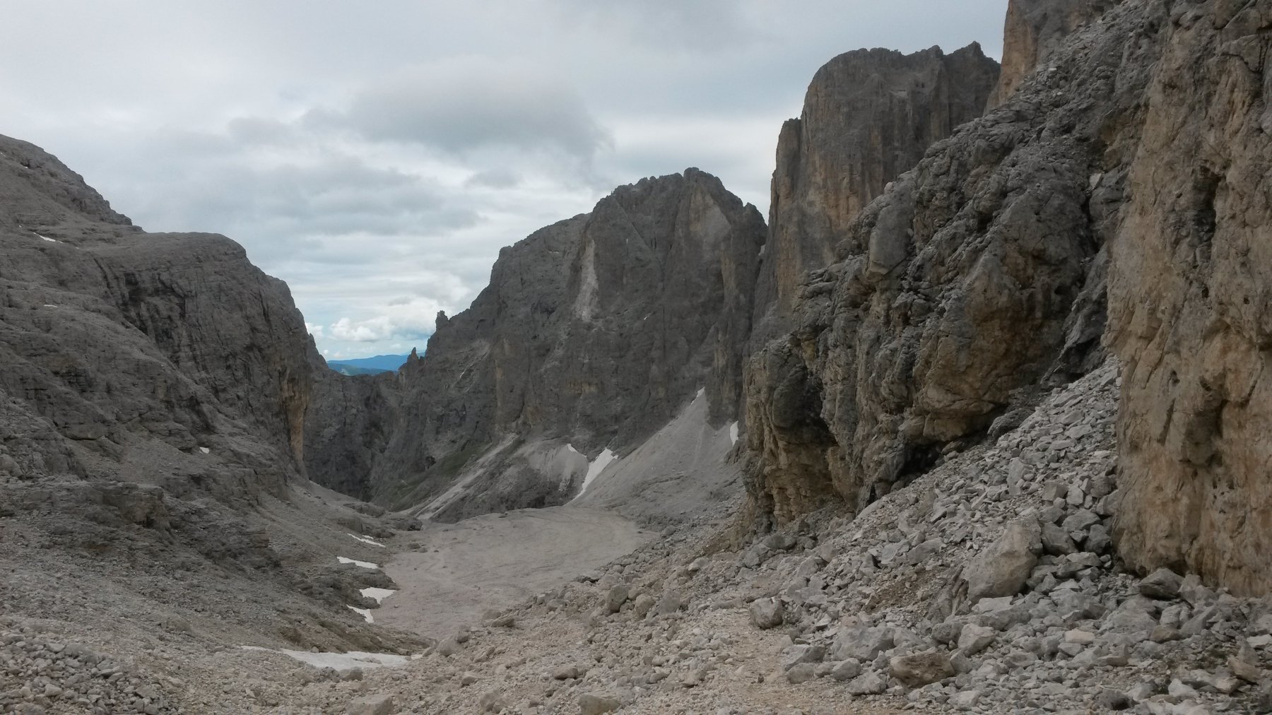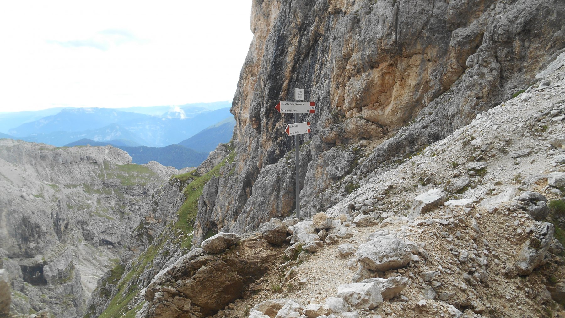 Un ultimo tratto attrezzato recentemente permette di evitare il finale sdruccilevole e porta proprio davanti al cartello indicatore. Dalla forcella il panorama si amplia ed il tetro scenario di pareti incombenti nell’ombra e di canaloni sprofondanti nell’abisso lascia il posto alla vista sul Sass Maor, la Cima della Madonna e la valle di Cismon.