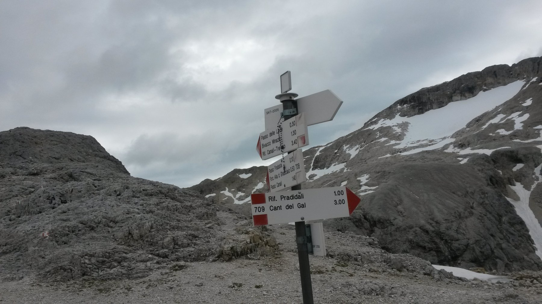 2) seguire il sentiero n°709 che, attraverso il passo Pradidali Basso, scende nel vallone fra Cima Fradusta e la Pala di San Martino, percorrendo la zona più caratteristica e suggestiva delle Pale, sia perchè ispirà “il Deserto dei Tartari” di Dino Buzzati, sia perchè passa sotto una miriade di cime (ad es. Cima Immink, Cima Pradidali, la Pala con il suo Bivacco, ben visibile dalla vicina cima delle Scarpe, chiamata così perchè lì gli inservienti lasciavano le scarpe per il ritorno degli alpinisti che usavano già le prime scarpette d’arrampicata) e pannacoli su cui sono state scritte pagine memorabili dell’alpinismo dolomitico: 2 ore e mezzo circa (percorso un po’ più lungo ma forse di norma preferibile per l’unicità dell’ambiente).