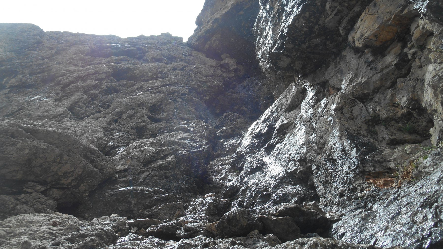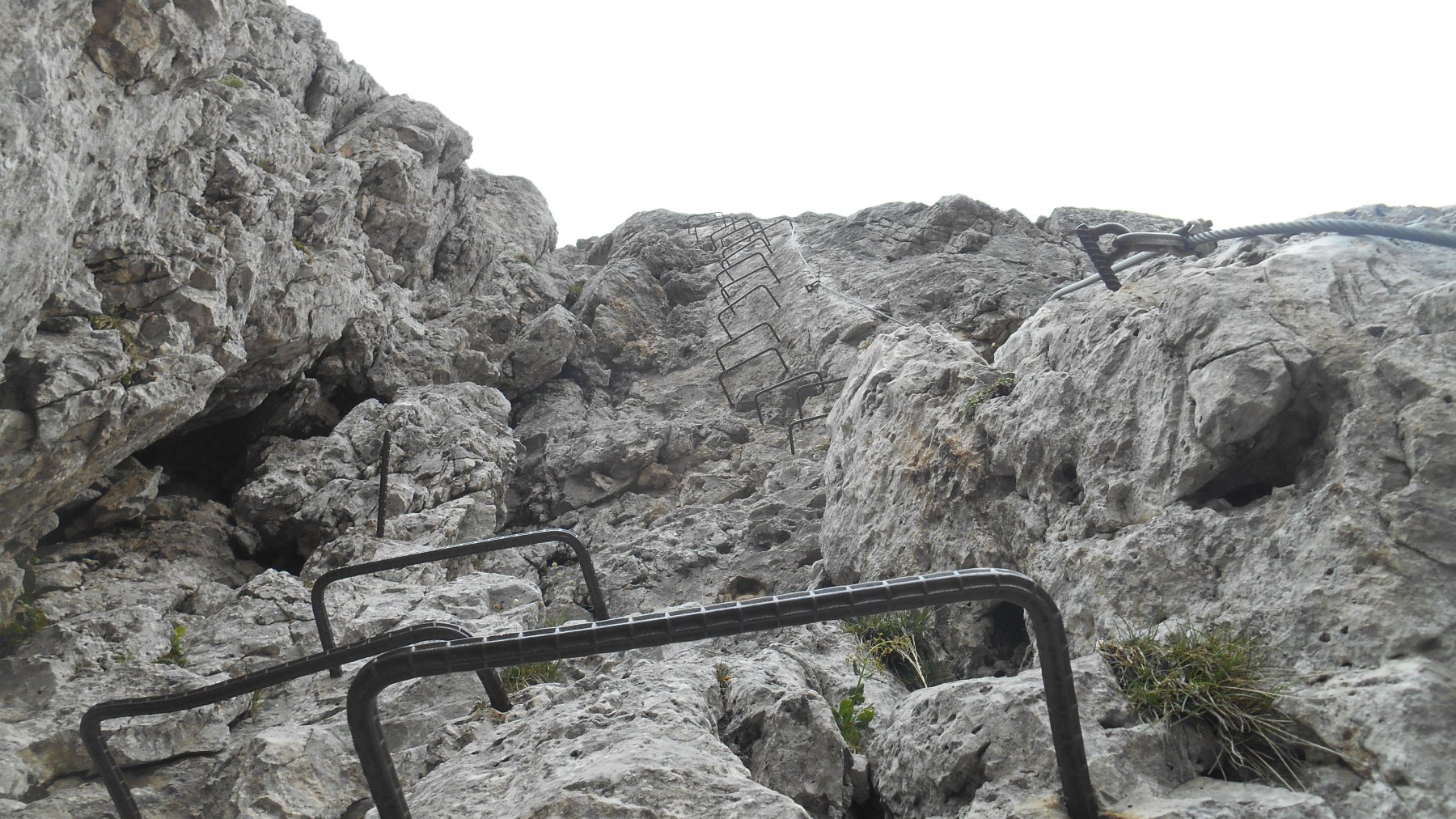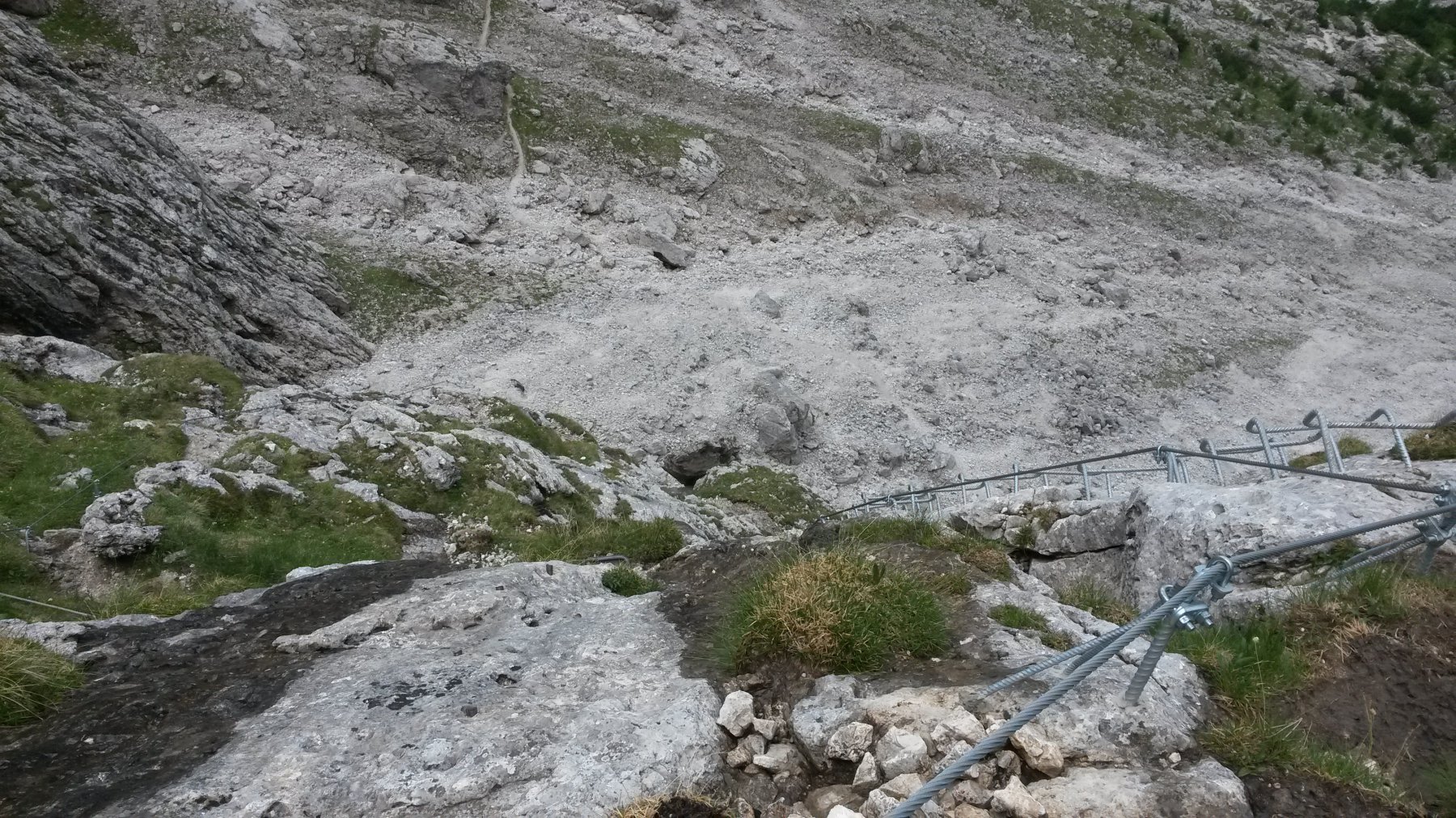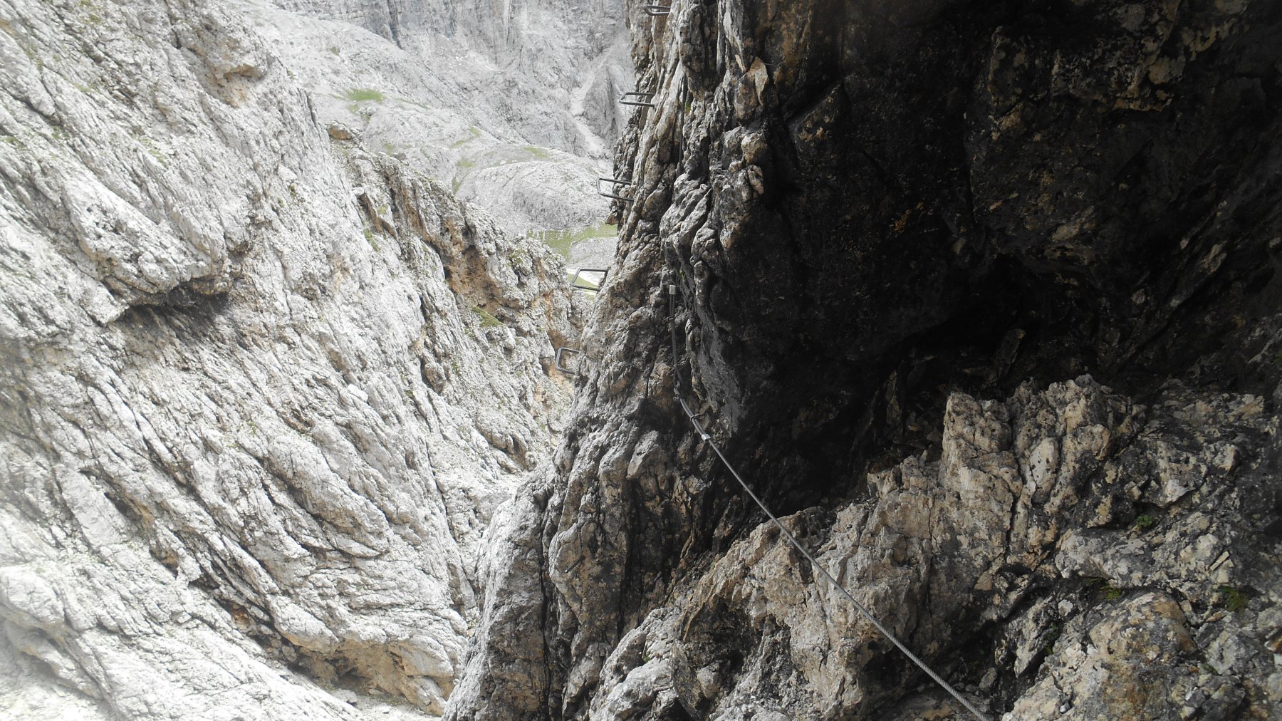 Da lì in poi la ferrata è completamente ed ottimamente assicurata. Dopo un primo tratto piuttosto verticale aiutatto da scalini, si attraversa a sinistra (esposto) e si giunge ad un tratto più comodo che porta sotto quello che probabilmente è il tratto “chiave”. Una ventina di metri di scalini verticali (forse leggermente strapiombanti per qualche metro, ma se si ha cura di stare un po’ più “indietro” e di usare anche gli ottimi appigli della roccia, si continia salire “appoggiati”) che portano nuovamente ad un tratto facile e pianeggiante, sospeso su un profondo canalone. Un tratto in discesa un po’” tormentato” (ma sempre ben attrezzato con scalini) deposita nella parte alta di detto canalone, che deve essere (faticosamente) risalito fin sotto la forcella del Porton.