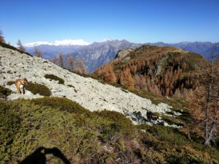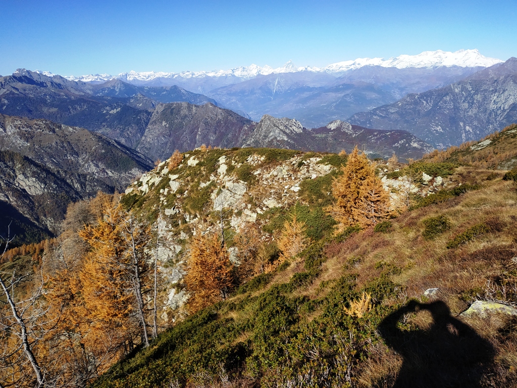 Dopo le forti piogge dei giorni scorsi mi evito la parte bassa e salgo con l’auto alla borgata Les Donnes (850 m) dove parcheggio in un piccolo slargo a pochi metri dopo le ultime case, pochi posti auto. Strade strette ben asfaltate ma da percorrere con cautela se bagnate e piene di foglie, specie in discesa. Si incontra un cartello di divieto dopo ulteriori 500 m circa. La prima parte della mulattiera è per lunghi tratti bagnata fino a quota 1600 circa laddove il bosco quasi si estingue e si aprono ampi pianori prativi davvero belli da vedere, attorniati dai colori dell’autunno che avanza. Comoda e decisamente più asciutta la salita al colle sempre su sentiero ben segnalato (alta via 2). Dal colle alla cima omonima per facili pietraie o esili tracce tra cespugli di rododendro, aggiungendo circa 100 m di dislivello. Il panorama ripaga la fatica e non è di molto inferiore ai rilievi più alti per quanto riguarda il colpo d’occhio su Rosa e dintorni, chiuso invece verso sud dai più imponenti rilievi della Valchiusella. La prima parte della salita è completamente in ombra: dopo abbondanti piogge è meglio aspettare qualche giorno per trovare condizioni migliori, a tratti sembrava di camminare su 2 saponette. In cima solo un escursionista salito dal Crest al quale si è aggregato il cane del ristorante, altri 2 nei pianori erbosi di ritorno da una anello con Alpe Bonze. E fatemelo dire: giornata fotonica! Allego traccia GPS.