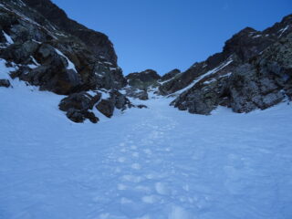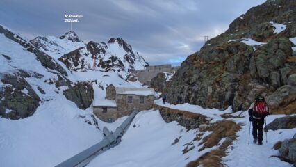 Itinerario in buone condizioni. L’assenza di neve facilita l’avvicinamento fino alla casa dei guardiani dove si incomincia a calpestare la prima neve un po’ ghiacciata salendo fino al Lago Nero. Da qua si continua su traccia nevosa ma non ghiacciata (ramponi utili ma non indispensabili) attraversando poi la diga del lago d’Aviasco fino a traversare e scendere verso il lago dove si continua nella valletta salendo fino all’attacco di un primo canale facile, che esce alla base del canale vero proprio. Canale nord in buone condizioni ben scalinato soprattutto la prima parte, in queste condizioni secondo me e da gradare PD+. Il passaggio finale è un po’ in magra, è facilitato per l’assenza di cornici , ma mette a nudo le precarie ma ben appigliate roccette d’uscita…occhio a cosa si prende in mano. Usciti dal canale affrontiamo in breve la facile la cresta che porta alla panoramica cima del M.Pradella. Discesa dalla via normale sempre bella ripida con cordine metalliche sgombre da neve che facilitano di molto la discesa alla selletta. Da li in giù i pendii nevosi all’ombra sono ricoperti da una corazza di ghiaccio infida tipo lastra di vetro, spessa un paio di centimetri. La traccia la troviamo già fatta e fratturata, ma occhio che se si dovesse inciampare e cadere fuori pista difficilmente ci si ferma, ramponi e picca utilissimi. Oggi buon affollamento 12 persone comprese noi su questo itinerario..