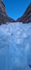 Ottime condizioni generali canale super tracciato quasi una scala. Un passaggio di misto abbastanza delicato a 3/4 e ultimi 15 mt in uscita asciutti ma molto facili occhio solo alla pessima roccia/terra. Discesa dalla normale ok.