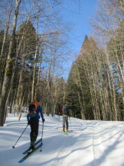 qui si scende il canale nordest della piella gia’ risalito il giorno prima con attacco a 45°, a meta’ del canale si puo’deviare a dx tagliando un valloncello in diagonale fino a pendii dolci sciabili si attraversano 80m di disliv di bosco fitto fino a reincontrare a quota 1350 il sentiero del giorno prima e si segue a ritroso lo stradello che porta a pian vallese e a febbio;