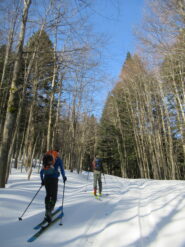 oppure si puo’ scendere tutto il canale che in basso si fa un fosso ripido poco sciabile e che conduce allo stradello suddetto grazie a beppe stauder noto sci alpinista della zona che ci ha condotto per questi monti