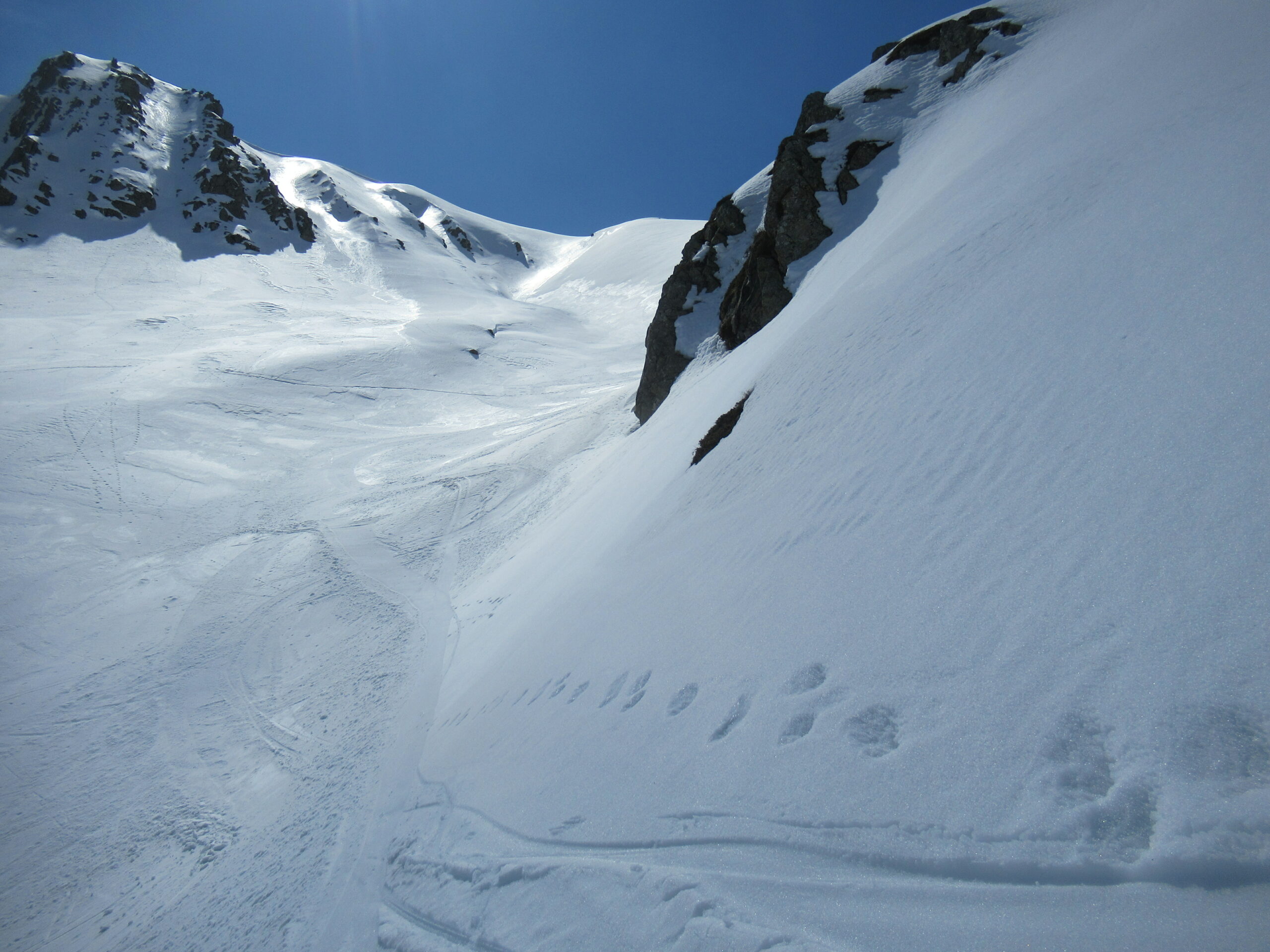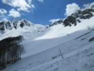 di qui discesa per il versante est del cipolla (due canali dalla vetta il piu’ a sx scendendo e’ piu’ inclinato 50° inizio con strettoia quello piu’ a dx e’ piu’ coricato 40° dislivello 300 m