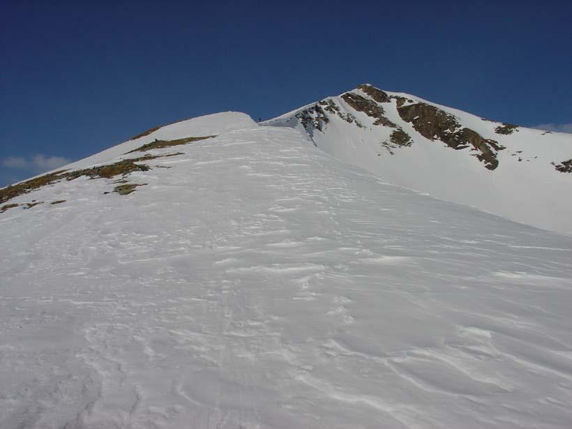 Alcuni saliti dal canale est ma a mio giudizio è meglio il cengione sopra la bastionata che senza svolte porta direttamente al colletto. Ultimi 30 metri a piedi.