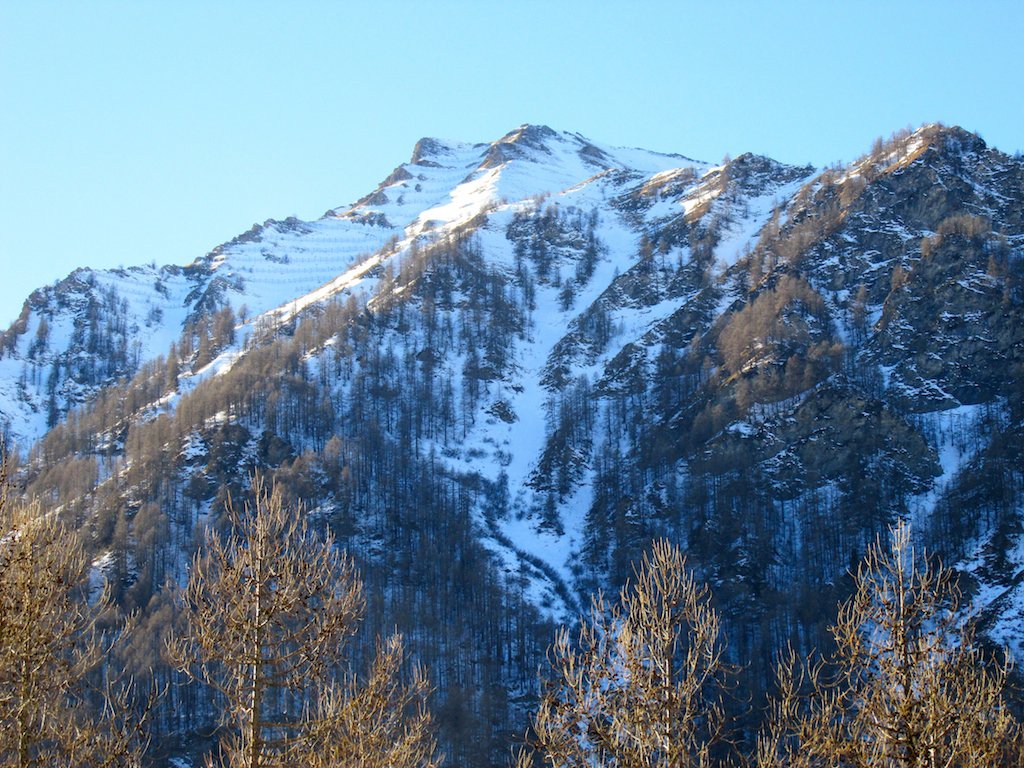 Discesa: risalire ancora ca30m il canale nevoso poi iniziare un lungo traverso delicato nel bosco a dx fino a oltrepassare le balze rocciose sottostanti. Infine iniziare la discesa per il bosco ripido fino a raggiungere il fondovalle sopra la borgata Cugno. Scendere verso dx fino al punto di partenza per prati.
