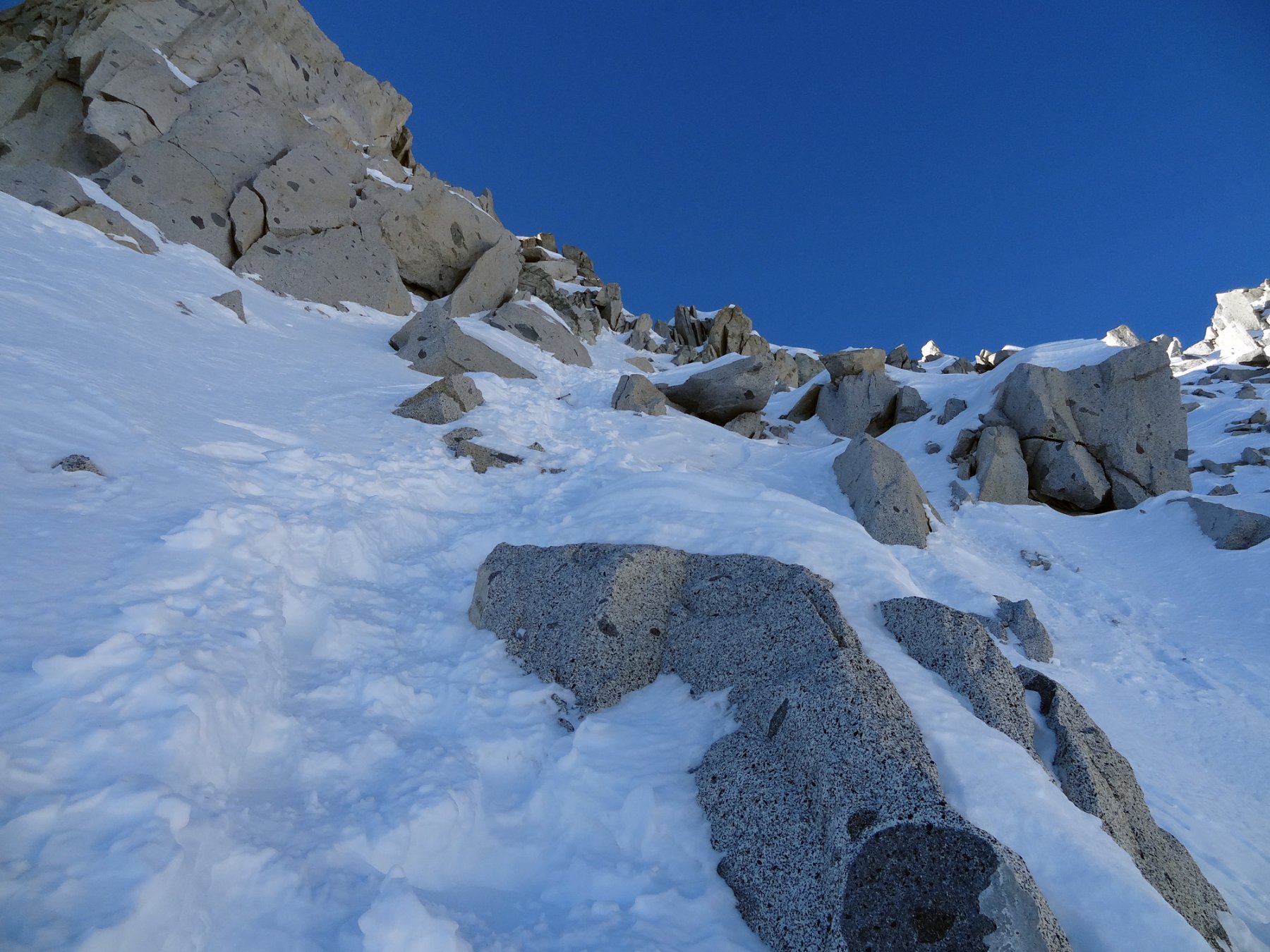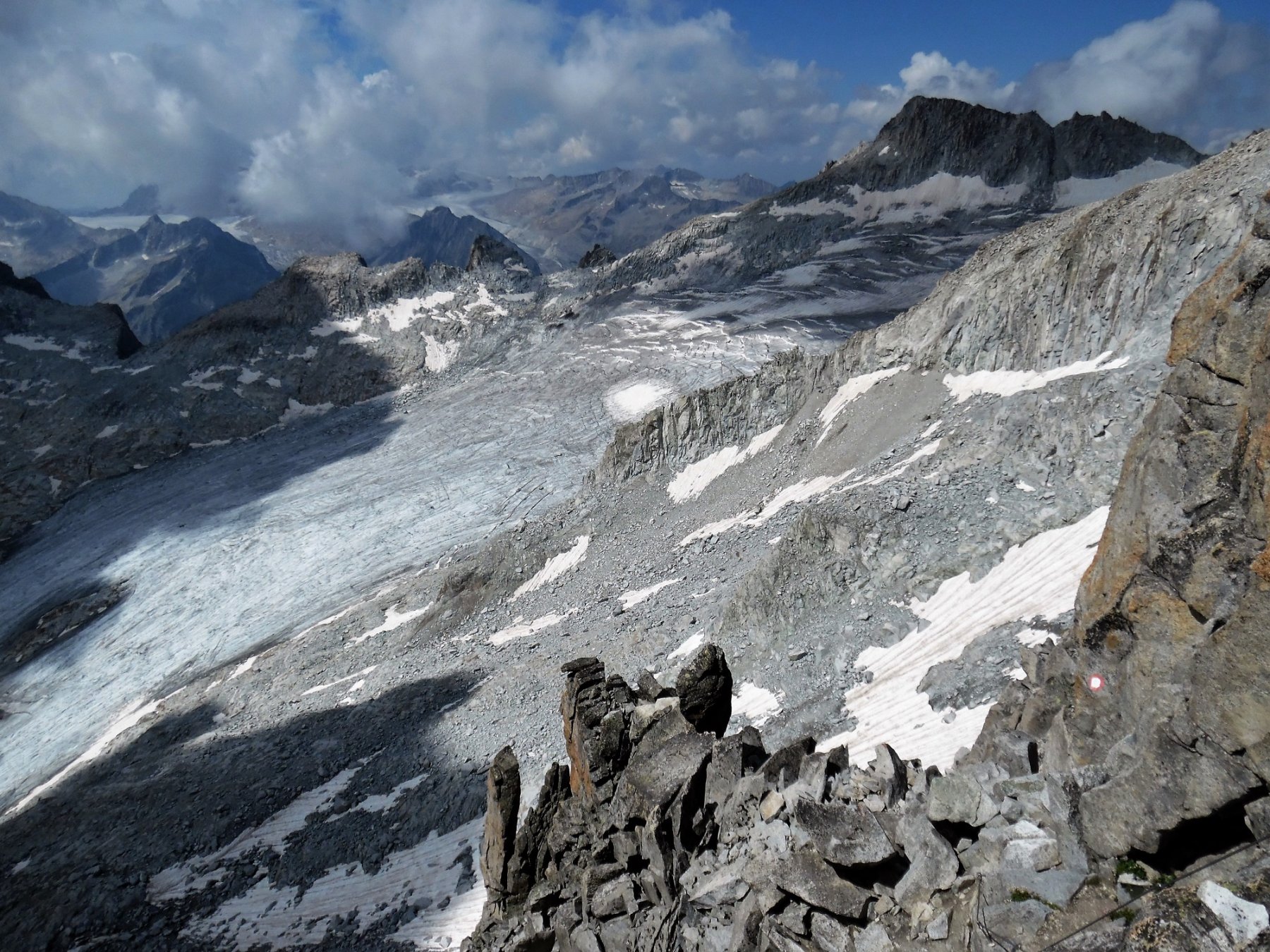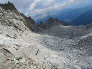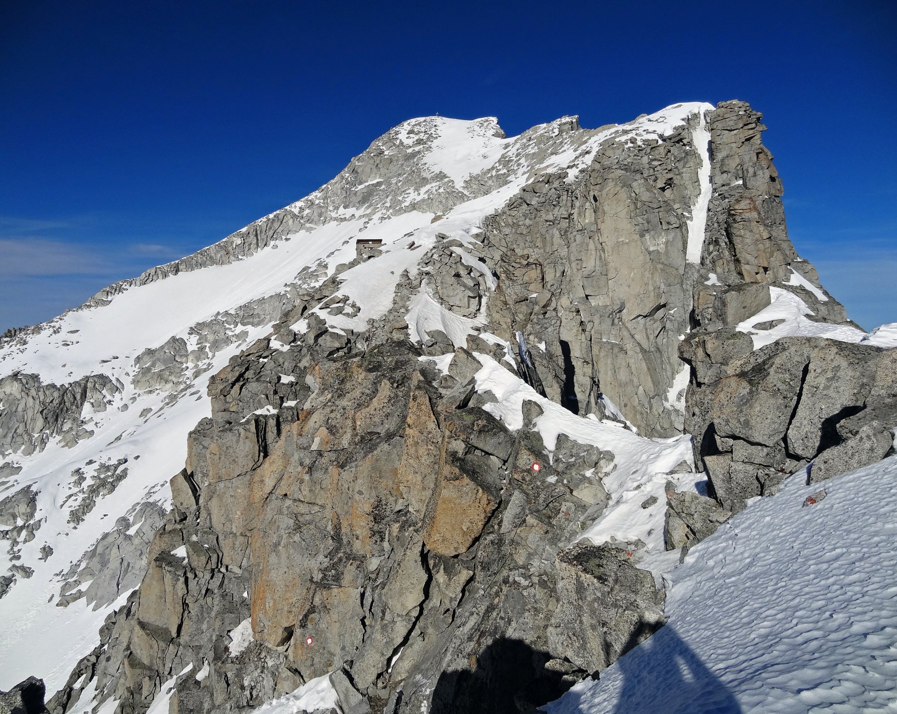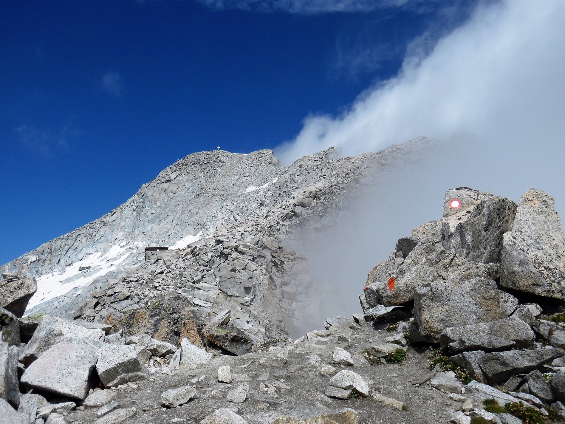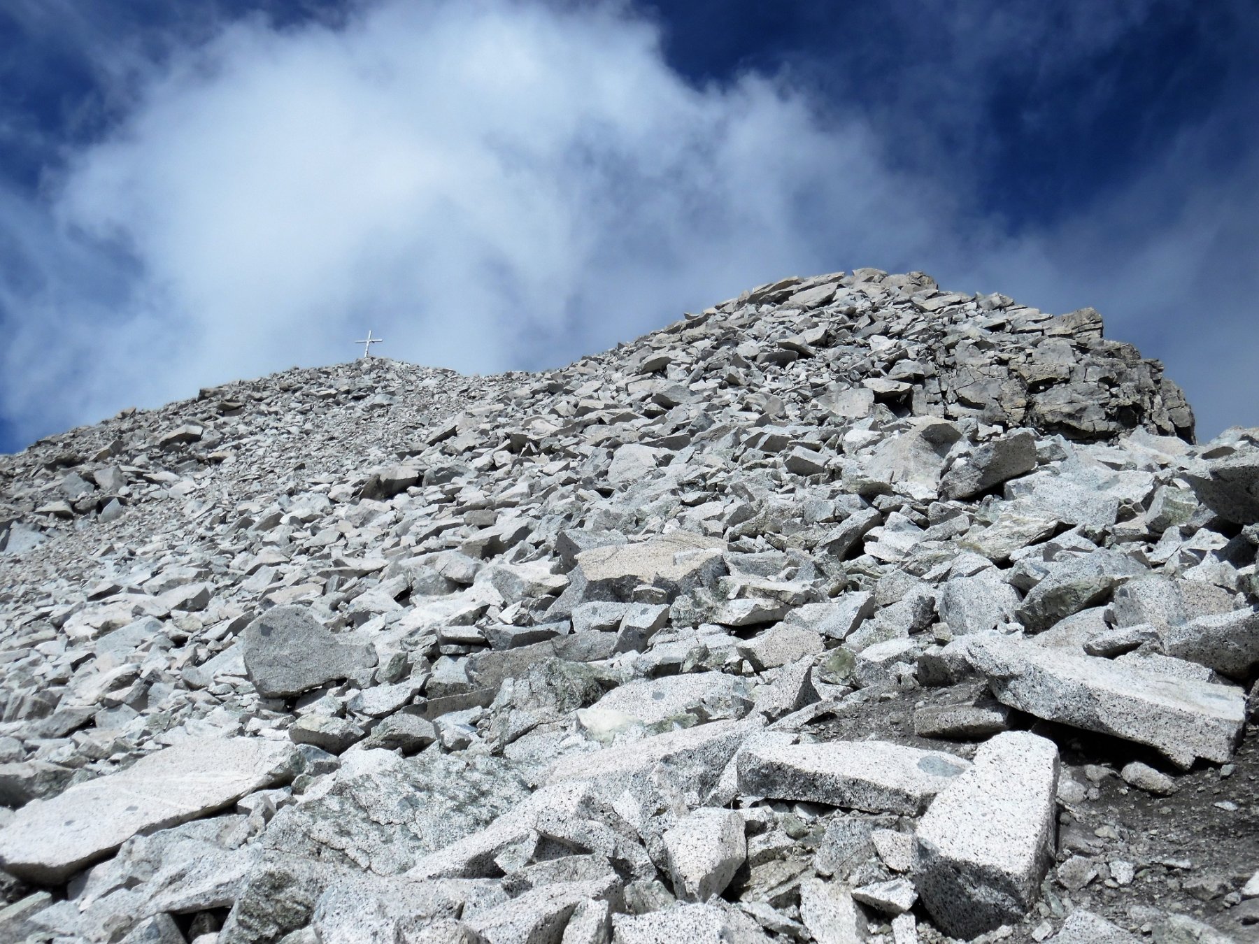 L’altra opzione, dal bivacco, è di percorrere una cengia che risulterà più evidente in discesa; questa cengia permette di evitare in gran parte la pietraia; presenta un breve tratto leggermente esposto che va affrontato con cautela, poi si raggiunge il centro del pendio sotto la cima, che si risale faticosamente seguendo la marcata traccia su ghiaia e pietrame di piccole dimensioni, sino a toccare la croce di vetta 3558 m.
