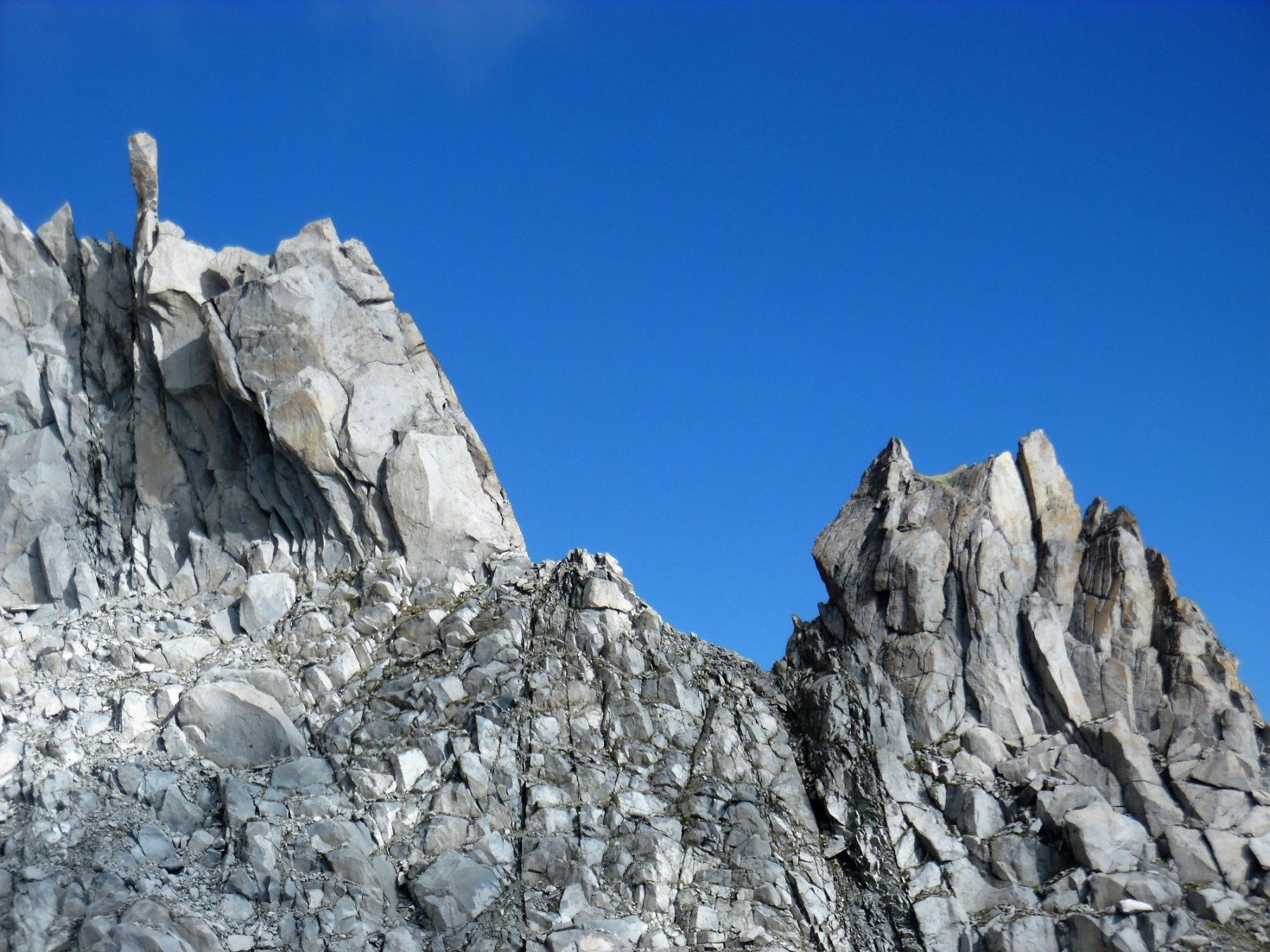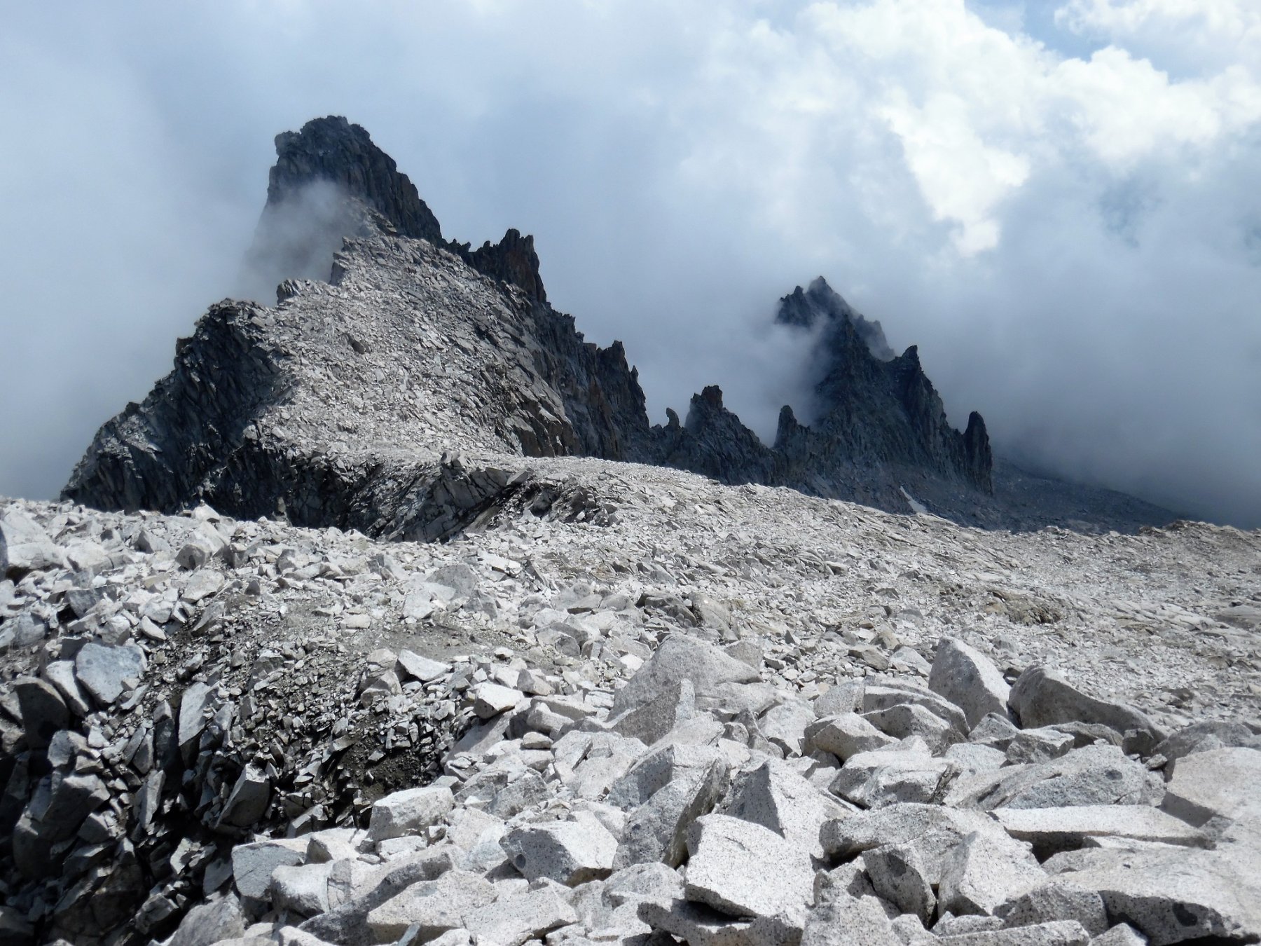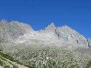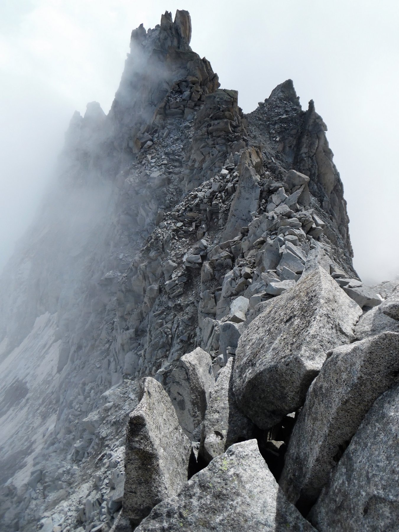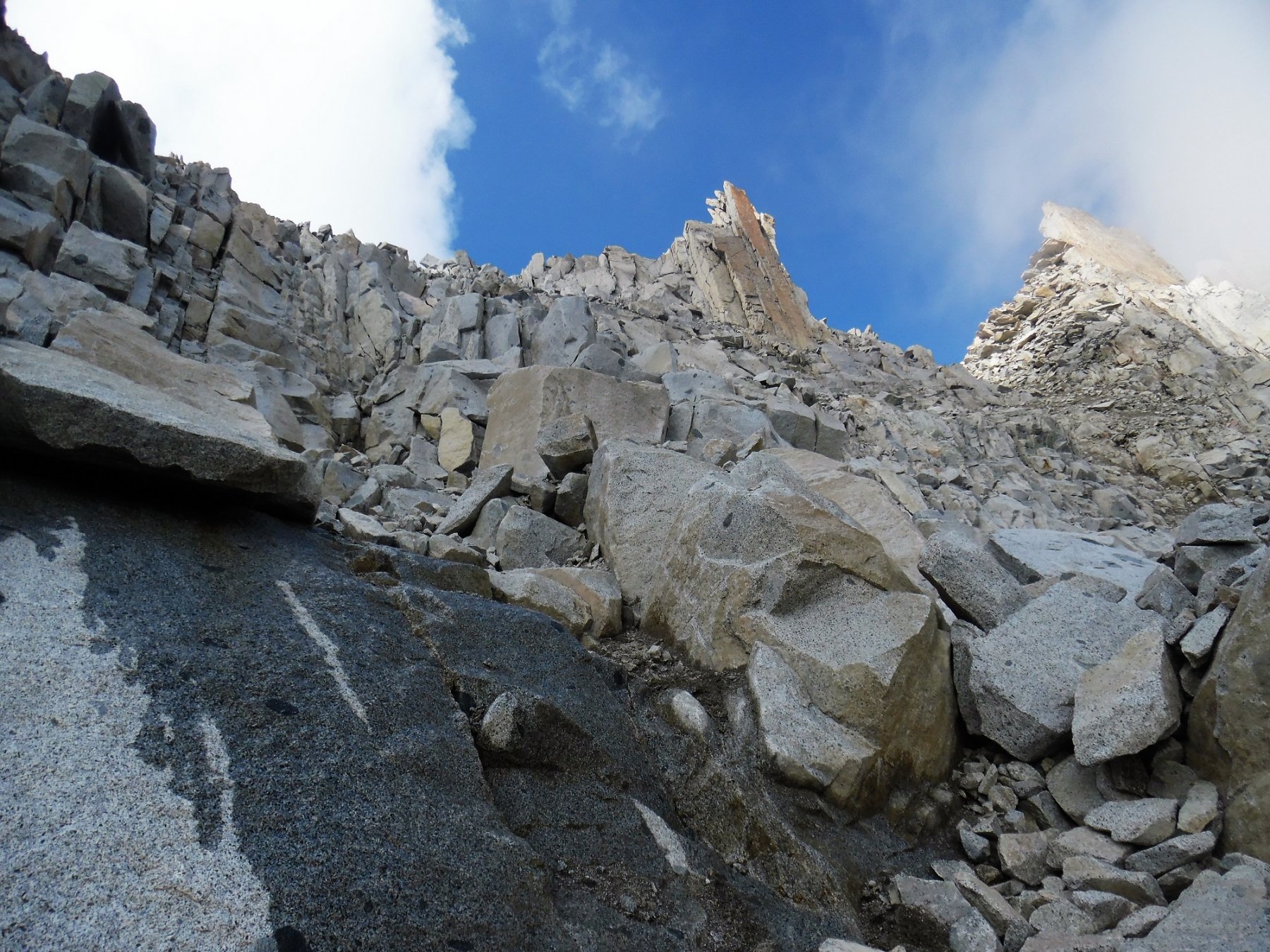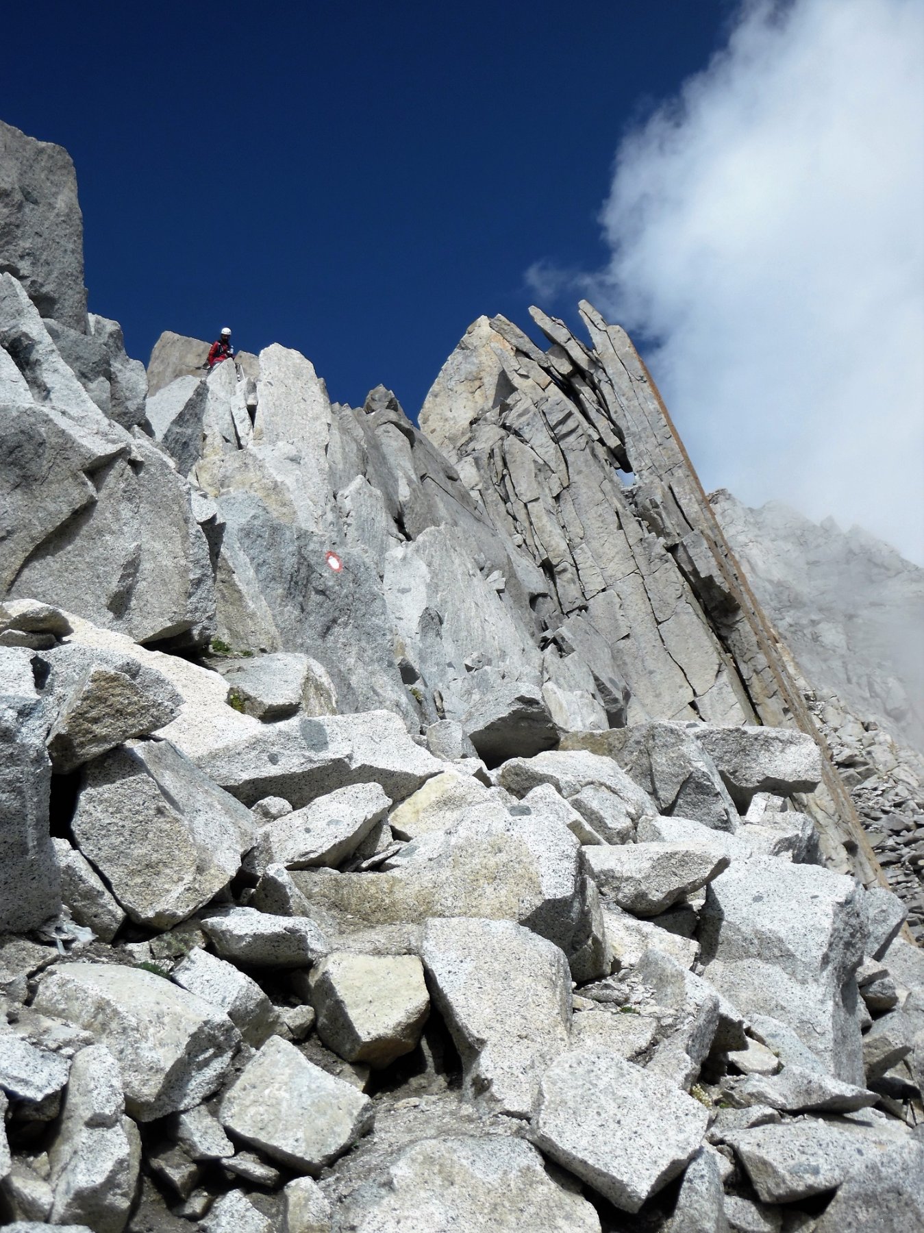 L’altra opzione, dal bivacco, è di percorrere una cengia che risulterà più evidente in discesa; questa cengia permette di evitare in gran parte la pietraia; presenta un breve tratto leggermente esposto che va affrontato con cautela, poi si raggiunge il centro del pendio sotto la cima, che si risale faticosamente seguendo la marcata traccia su ghiaia e pietrame di piccole dimensioni, sino a toccare la croce di vetta 3558 m.