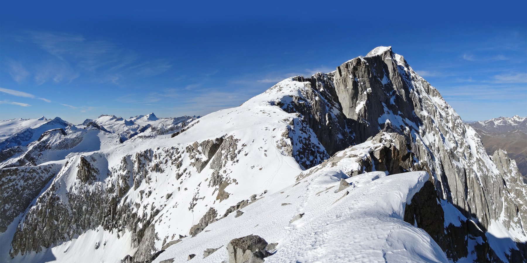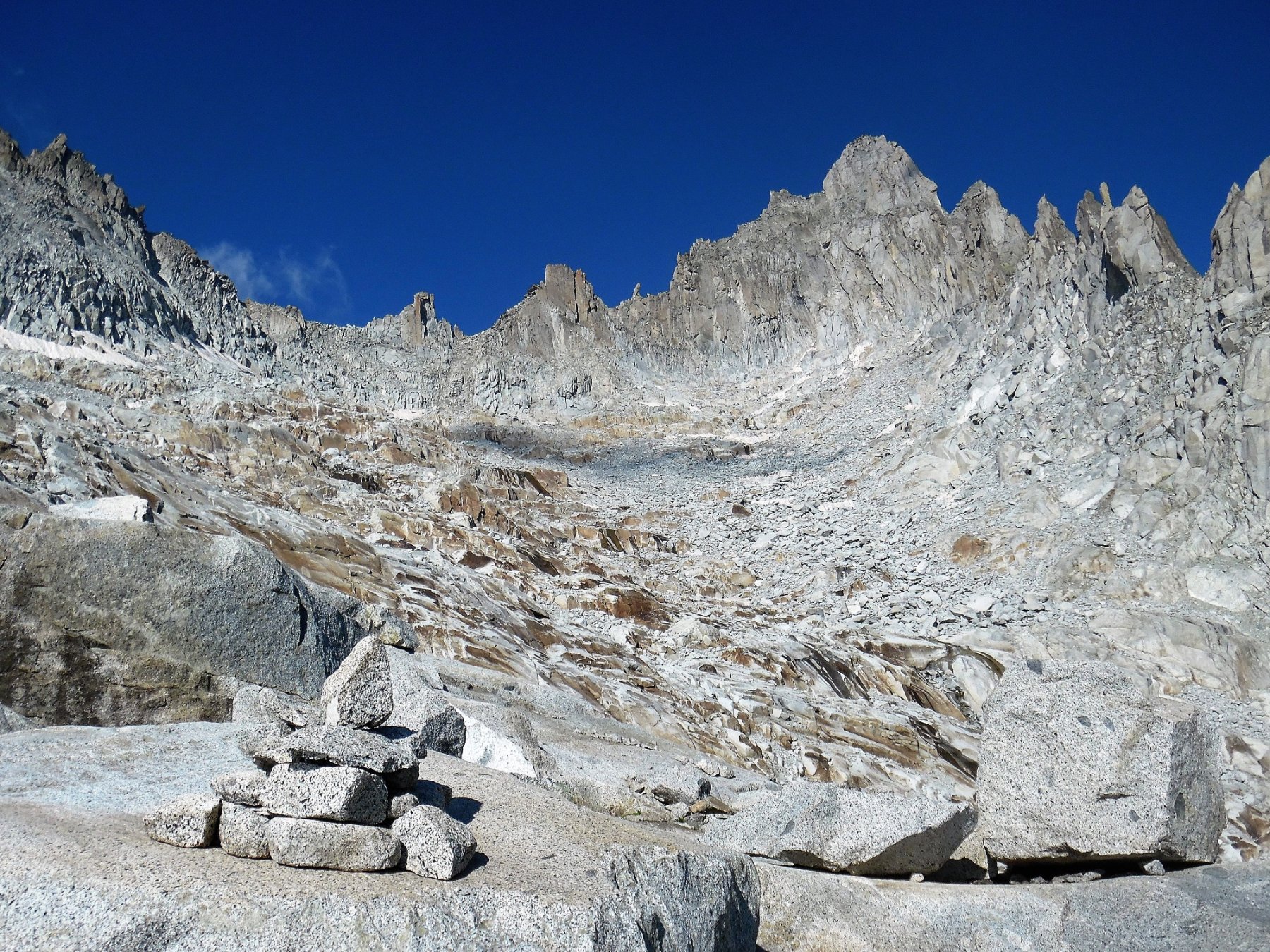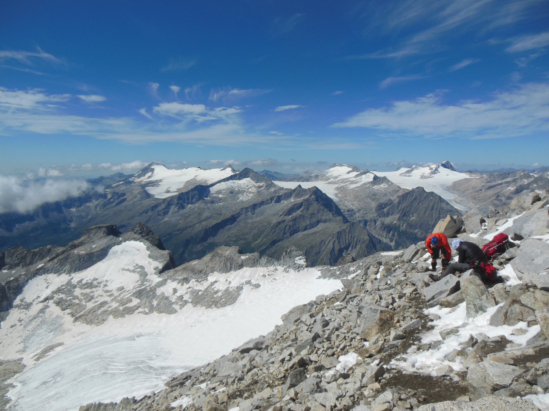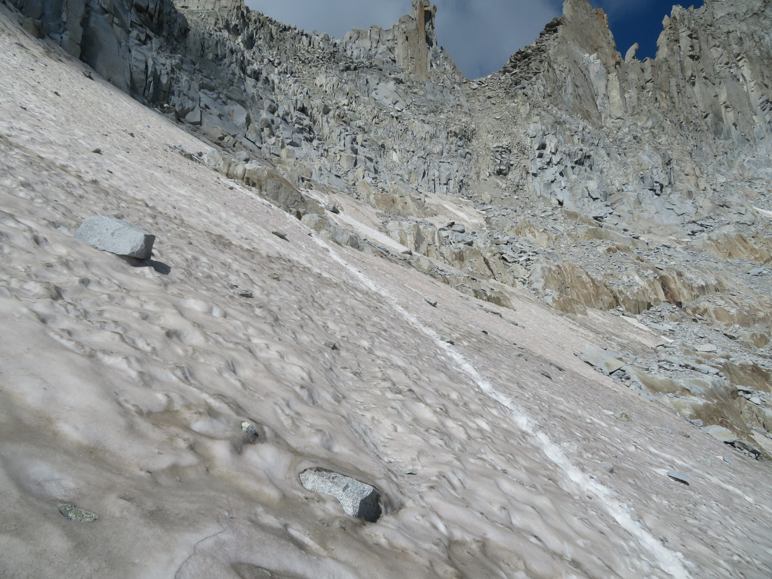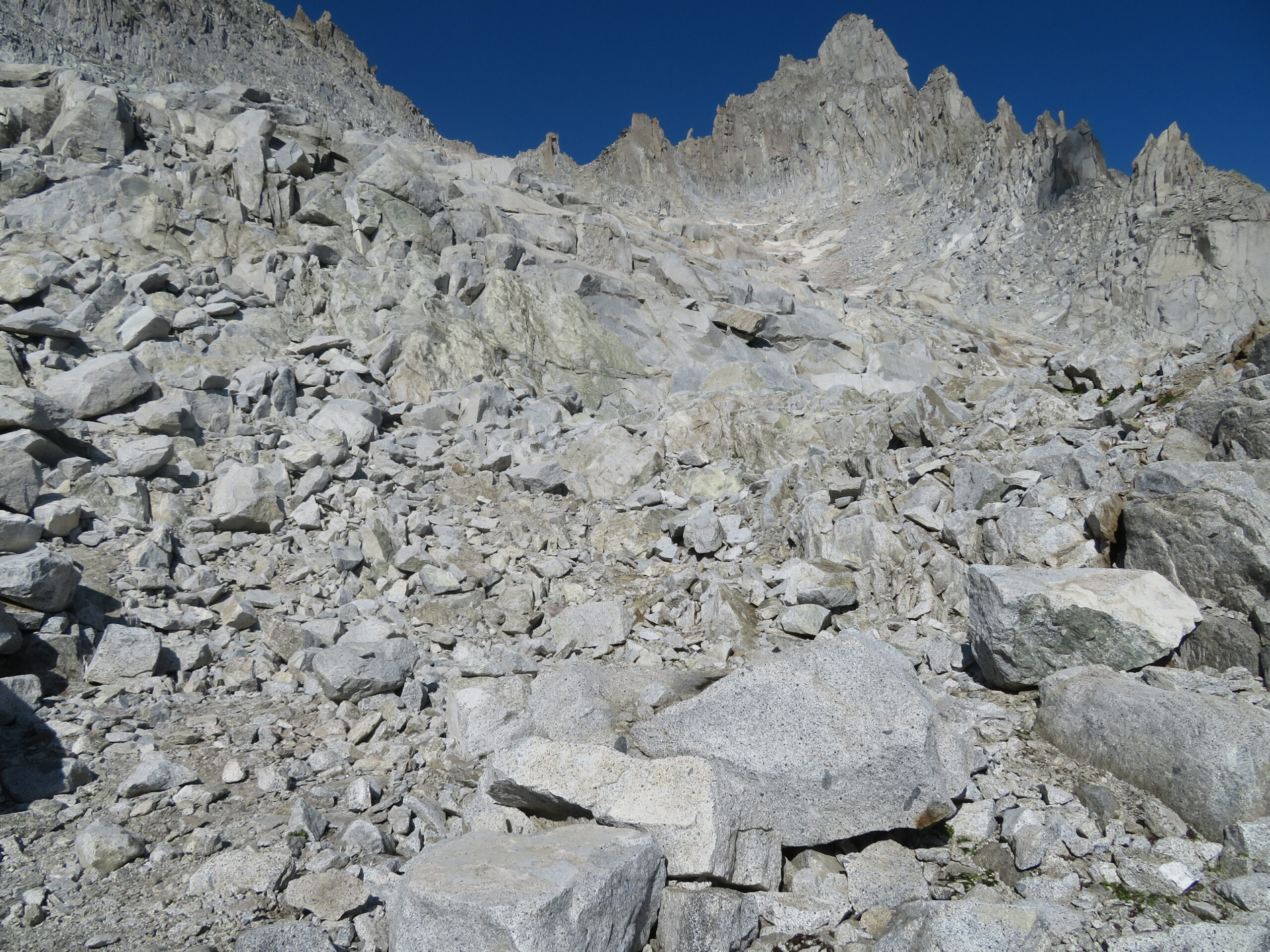 L’altra opzione, dal bivacco, è di percorrere una cengia che risulterà più evidente in discesa; questa cengia permette di evitare in gran parte la pietraia; presenta un breve tratto leggermente esposto che va affrontato con cautela, poi si raggiunge il centro del pendio sotto la cima, che si risale faticosamente seguendo la marcata traccia su ghiaia e pietrame di piccole dimensioni, sino a toccare la croce di vetta 3558 m.
