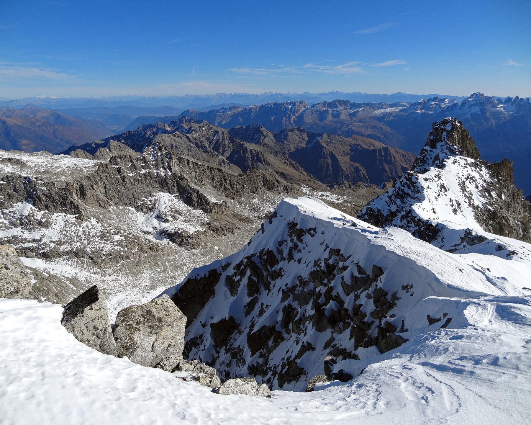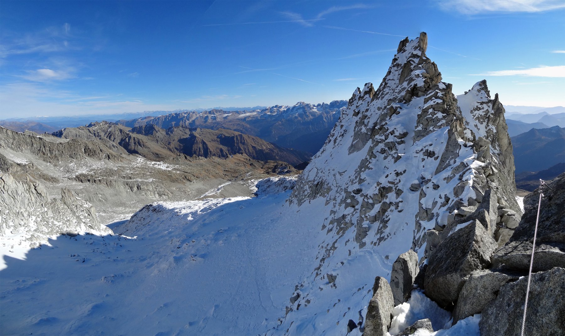 Discesa per il percorso di salita oppure, in alternativa, si può scendere lungo la cresta O/NO su roccette e sfasciumi fino sulla Vedretta di Nardis, che si percorre fino a quota 3000 circa (pendenze lievi, qualche evidente crepaccio). Abbandonata la vedretta, si iniziare una lunga traversata verso sinistra (percorso da individuare, inizialmente tra rocce montonate, poi pietraie, infine un po’ di prati. Poche tracce di passaggio e sporadici piccoli ometti) fino a raggiungere, dopo una breve ma ripida risalita, il Passo dei quattro Cantoni 2780 m, da cui un sentiero segnalato, inizialmente molto ripido, riconduce sul versante Val Nambrone al Rifugio Segantini.