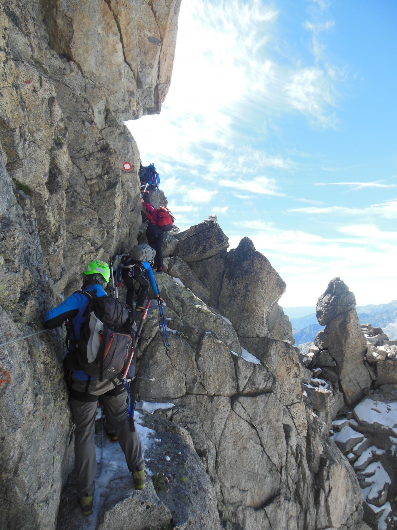 Seguendo il filo di cresta ci si imbatte nell’ultima tratta attrezzata, molto semplice in quanto dopo una breve discesa la fune serve solo da corrimano su una comoda cengia e quindi si risale per un canalino elementare, sbucando sul ripiano con il Bivacco Brigata Orobica 3382 m.