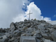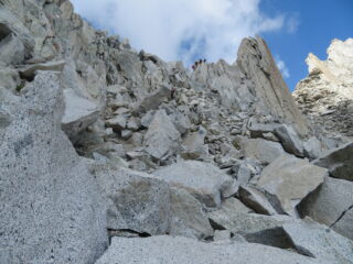 Ora non resta che puntare alla cima, ormai ben evidente; per raggiungerla si presentano due opzioni: ci si mantiene sulla pietraia a monte del bivacco, seguendo i numerosi ometti che si snodano nella vasta pietraia di grossi blocchi (indicativamente si percorre la cresta sud-est) superando facili passi di I per poi piegare a sinistra negli ultimi metri toccando la croce di vetta.