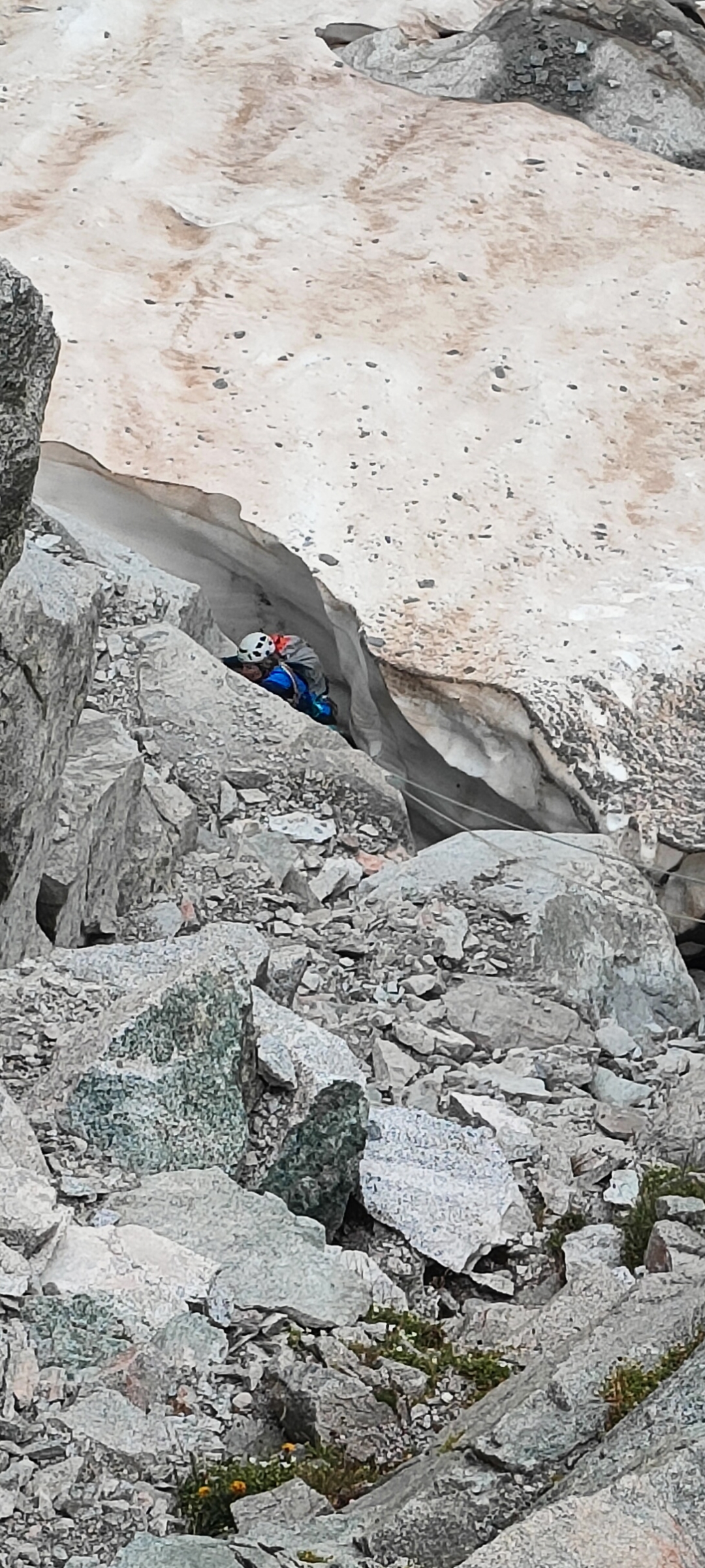 opzione 1: in doppia lungo la via. Dalla S9 alla S7 (con possibilità di spezzarla in due). Da qui si rifà il breve tiro in traverso e si arriva alla S6. Da qui doppia da 55m fino alla S5 (possibilità di spezzarla in due). Da S5 a S3 con una doppia da 60m. Da S3 alla sosta intermedia del secondo tiro. Da qui con un’altra doppia da 20 m e si arriva alla S1. Da qui con una doppia sul nevaio sottostante da 60 m si raggiungono le pietraie dell’andata