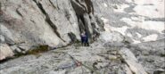 Si sale verso l’evidente diedro-canale che resta a destra della via. Si risale lo zoccolo nel punto più facile fino ad un terrazzino. Poco sopra si vede un fix con cordino.