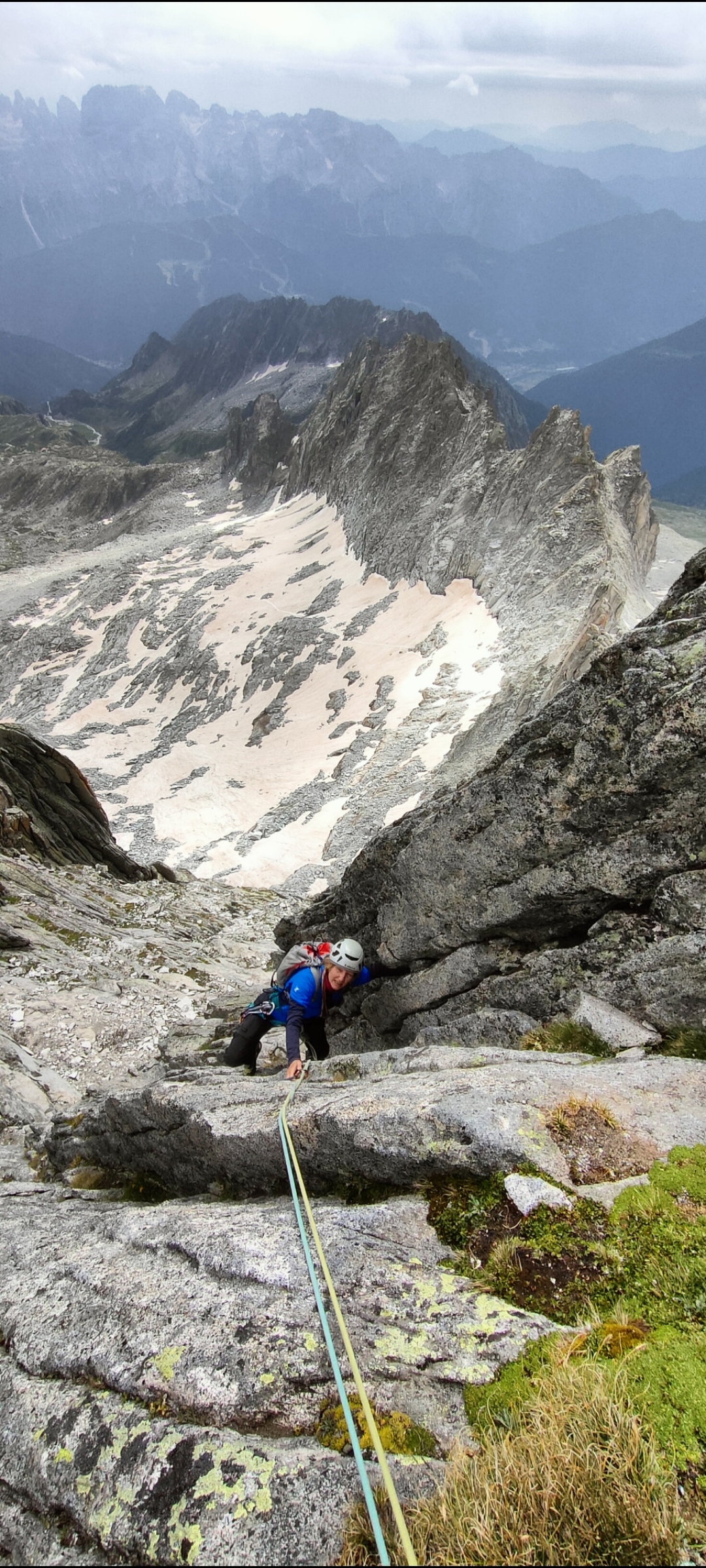 - L9: Salire in verticale per roccia lavorata. Superare una sosta intermedia e arrivare ad un colletto in cresta. Ora verso sinistra nella fessura centrale (cordone) con passo non facile, arrivando così in cima (40m, IV, 1 fix + 1 crd)