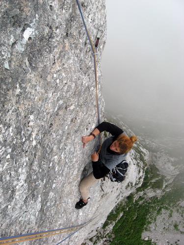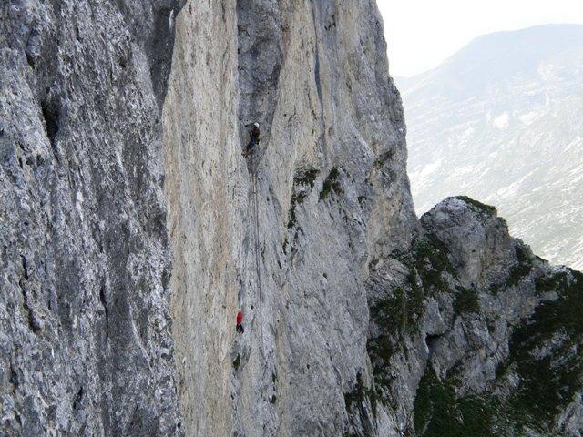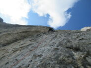 - L3, 6b+: traversare a dx e poi salire in obliquo a dx. Si sale quindi in continuità su muro fino in sosta.