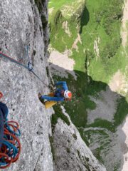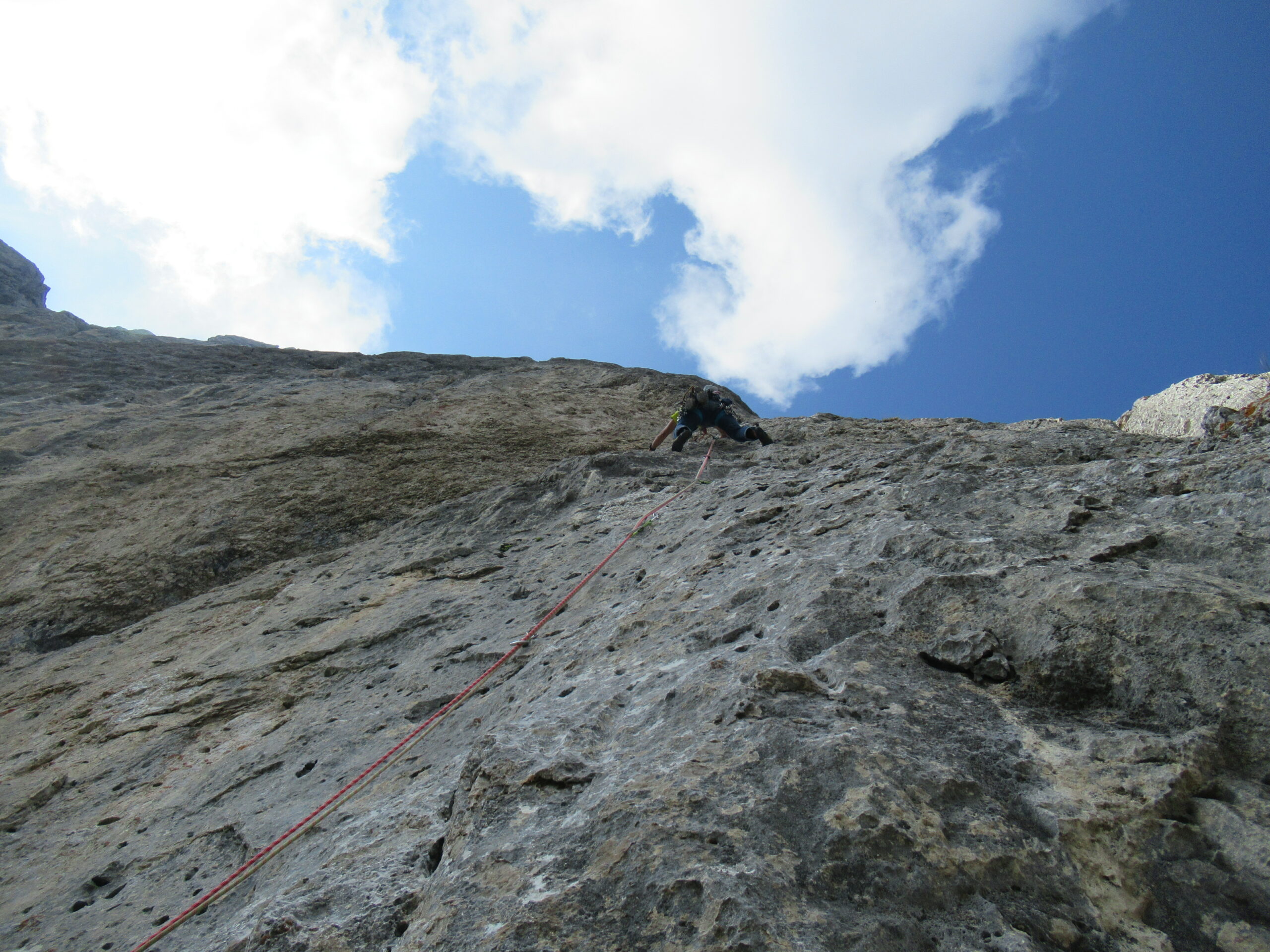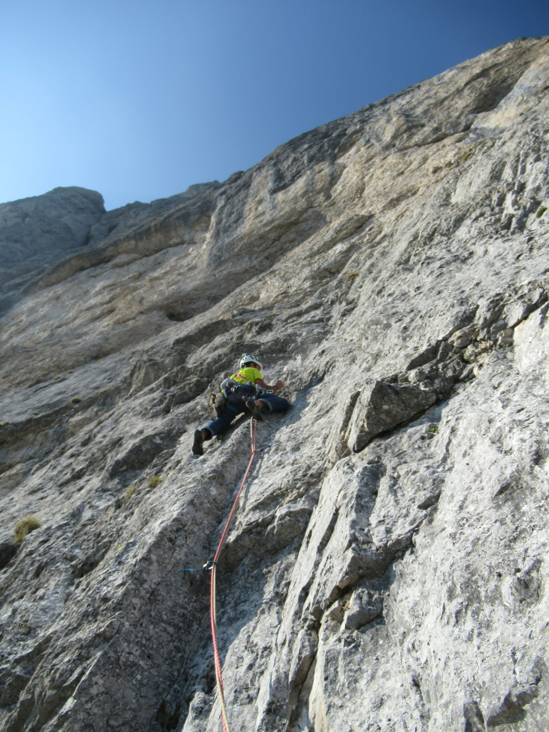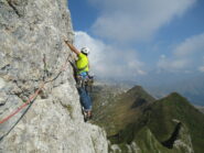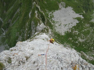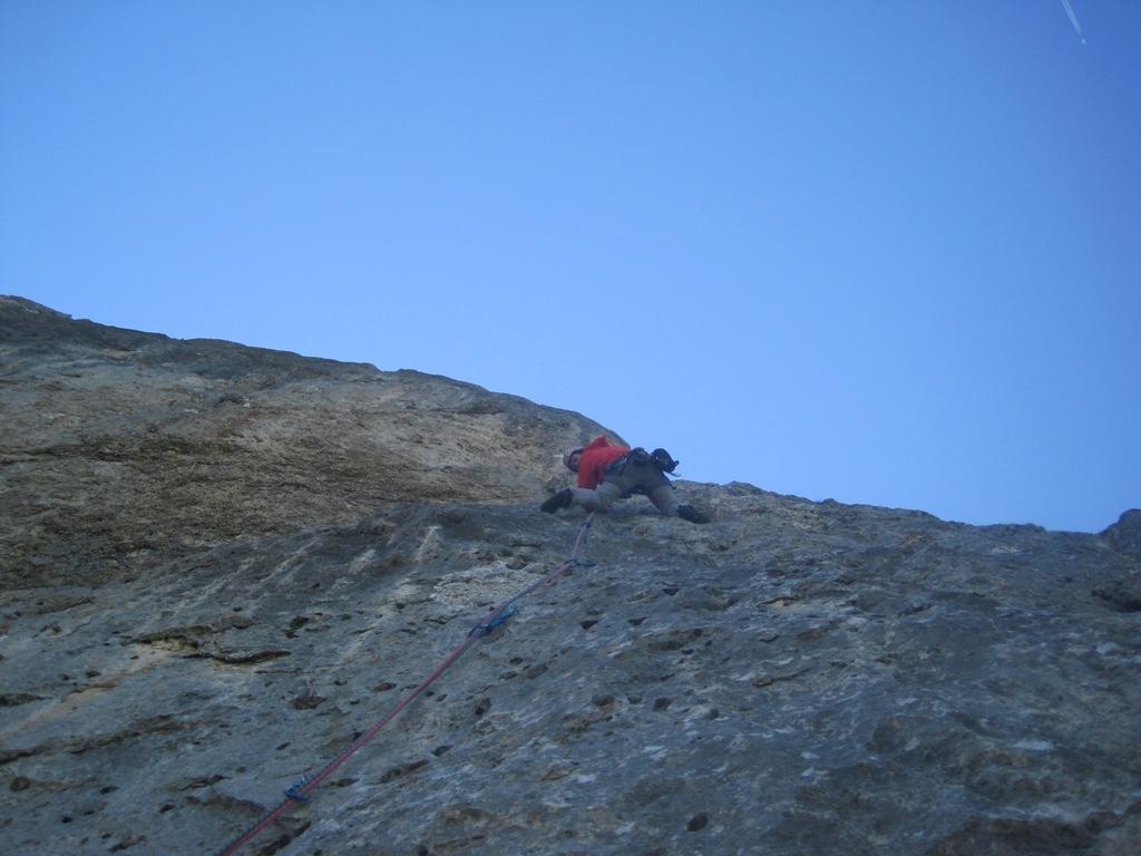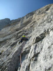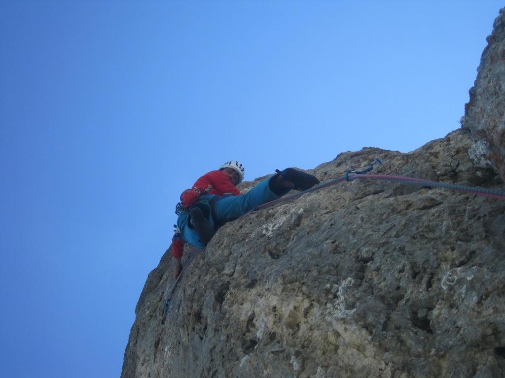 - Doppia da 60 metri sullo spigolo che porta alla sella della sosta 7 (eventuale sosta a dx, faccia alla parete, a circa 40m);