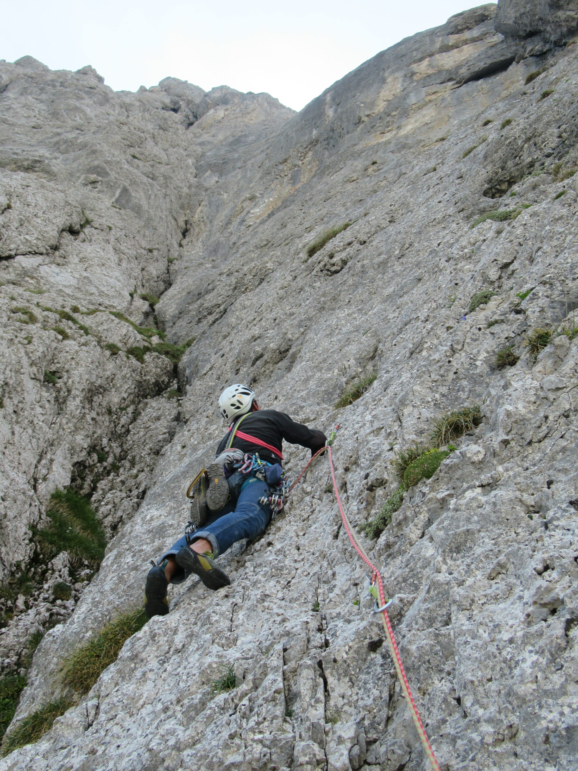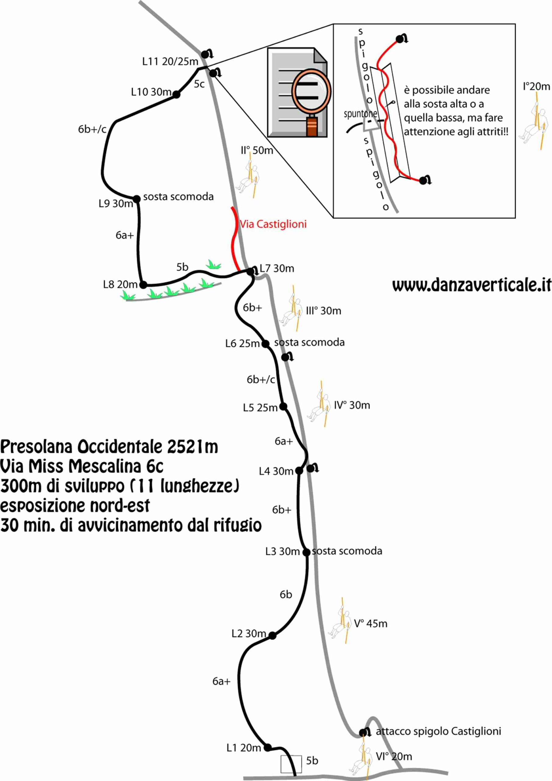 - L11, 5c: salire e traversare subito a dx grazie ad una fessura e a buone liste per i piedi, fino ad uno strapiombino (subito sopra fix non visibile), quindi per pilastrino con roccia a tratti delicata, poi ancora a dx per entrare in una zona più articolata, e infine salire in sosta sullo spigolo (roccia in alcuni punti da verificare).