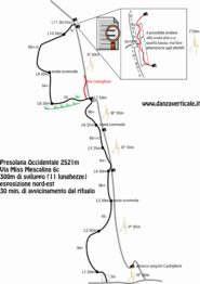 - L2, 6b: andare a sx e salire per diedro e rocce non facili da leggere, infine non salire su cengia ma attraversare a dx (fix) per una decina di metri, fino alla sosta.