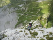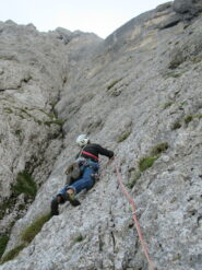 - L8, 4a: traversare a sx doppiando lo spigolo, quindi per roccette e poi in leggere discesa per cengetta, fino alla sosta sotto una placca.