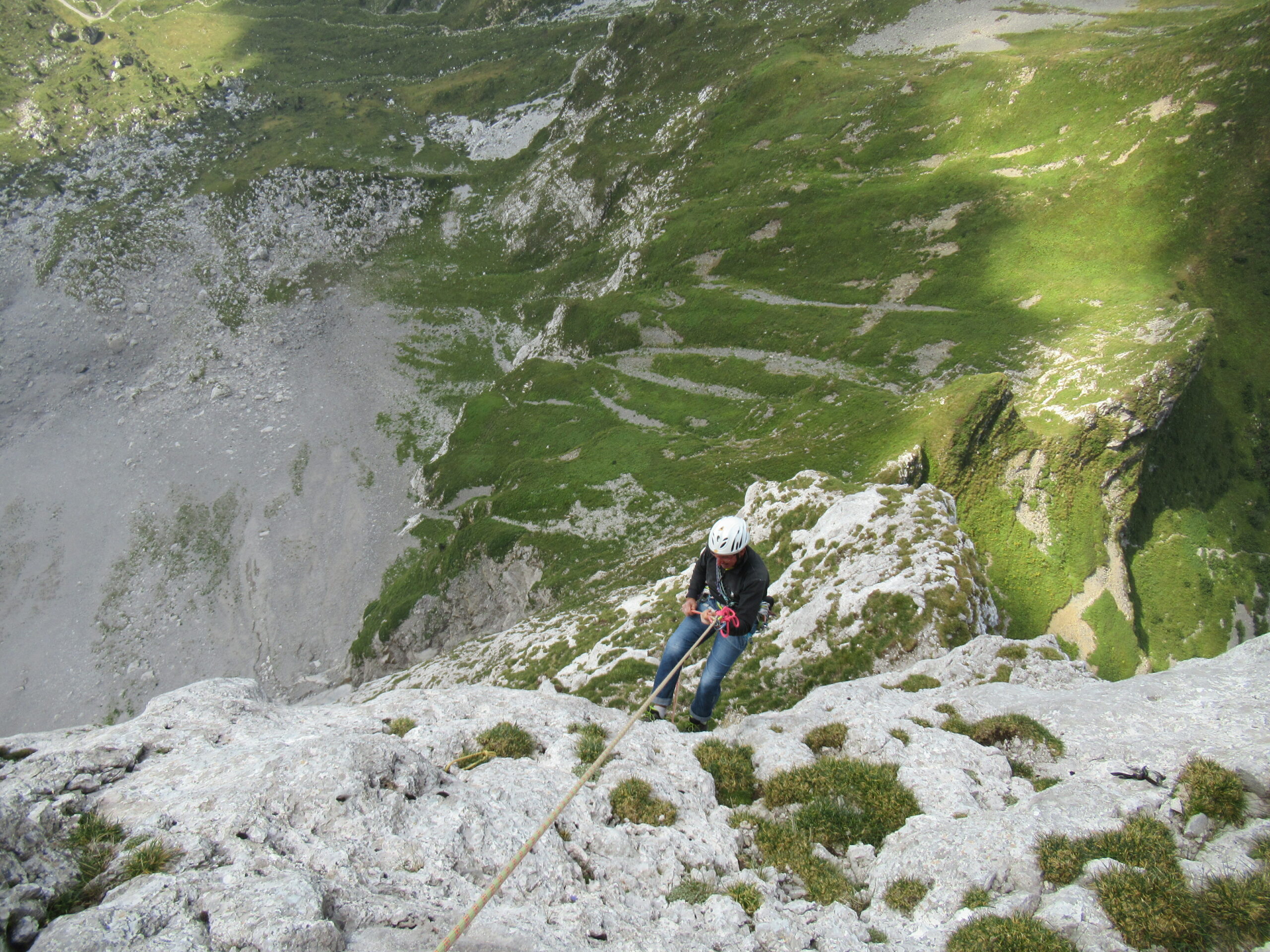 - Doppia da 30 metri verso la base dello spigolo (ma non si arriva alla base per pochi metri, fermarsi alla prima sosta di calata che si trova);