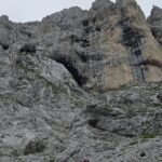 - L1, 4c: piccolo zoccolo; salire seguendo gli spit per pochi metri, fino ad una cengia con sosta a sx (da sx sale una corda fissa che arriva a questa sosta, probabilmente da usare in caso di neve).