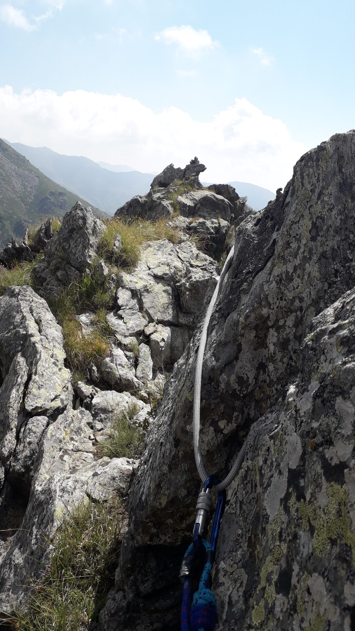 Salgo prima la est leggermente piu’ impegnativa. Non uso la corda, ne metto le pedule in questo frangente. La adoperero’ a calare in doppia, lasciando un cordino d’abbaddono attorno a un masso. Forse un passo di III e poi e poi. Trovato piu’ impegnativo in verita’ passare alla ovest mantenendo il filo di cresta. Un solo passo ma aereo, esposto, e per niente banale con prese da tastare accuratamente.