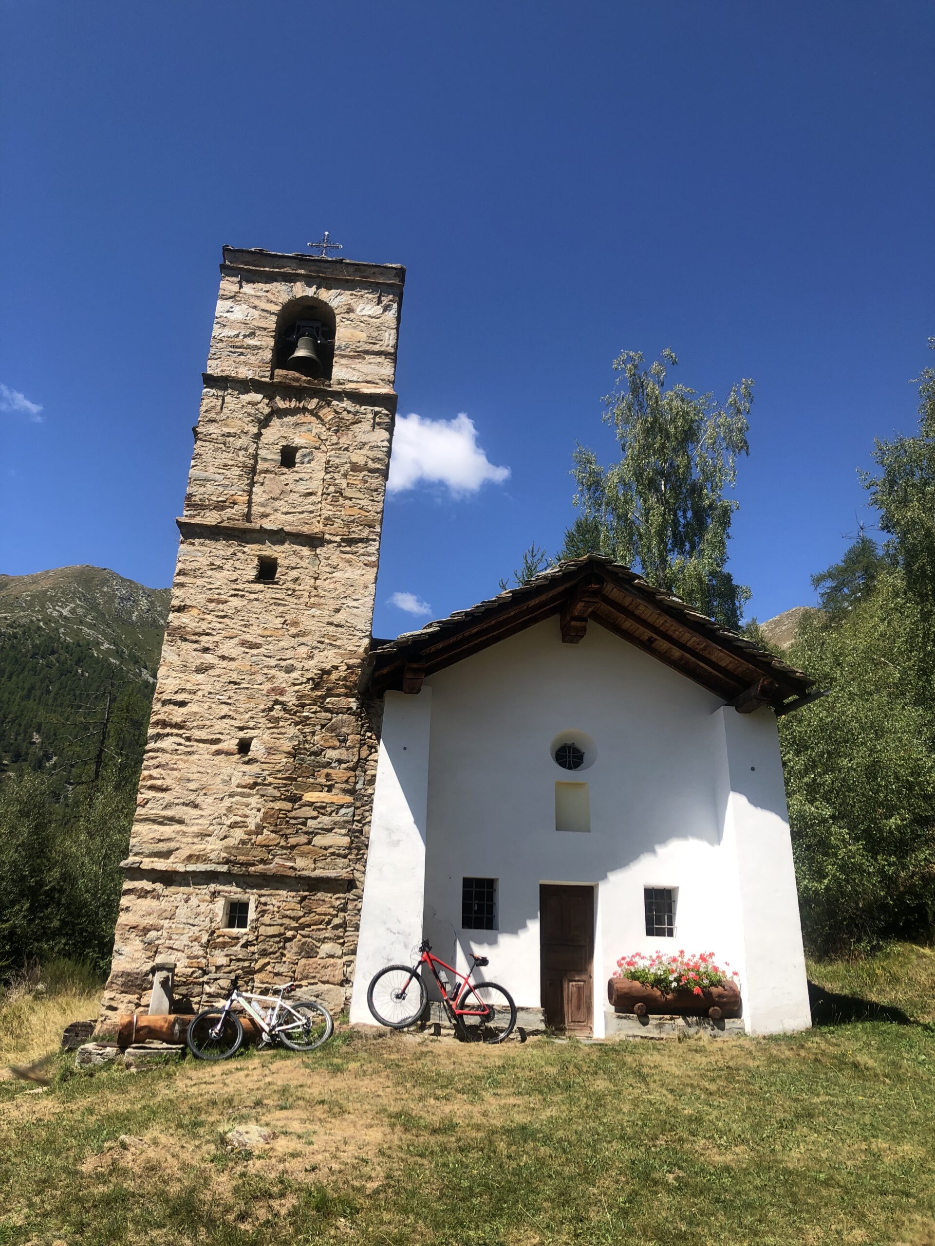 A destra inizia la poderale che senza incertezze di percorso porta a Coulot, Kiry, Cappella di Kiry 1600m., A. Prial desot 1924m – e con pendenze ancora più accentuate all’ A. Prial damon 2241m (termine strada). Con bici al fianco fino al Col Prial 2329m (croce) ed a piedi in vetta al M. Prial 2411m. Discesa sull’itinerario di salita.