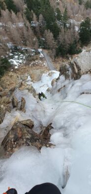 - Il terzo tiro è quello chiave con un tratto verticale di 7-8 metri. Il tiro è di 60 metri circa e si fa sosta su ghiaccio.