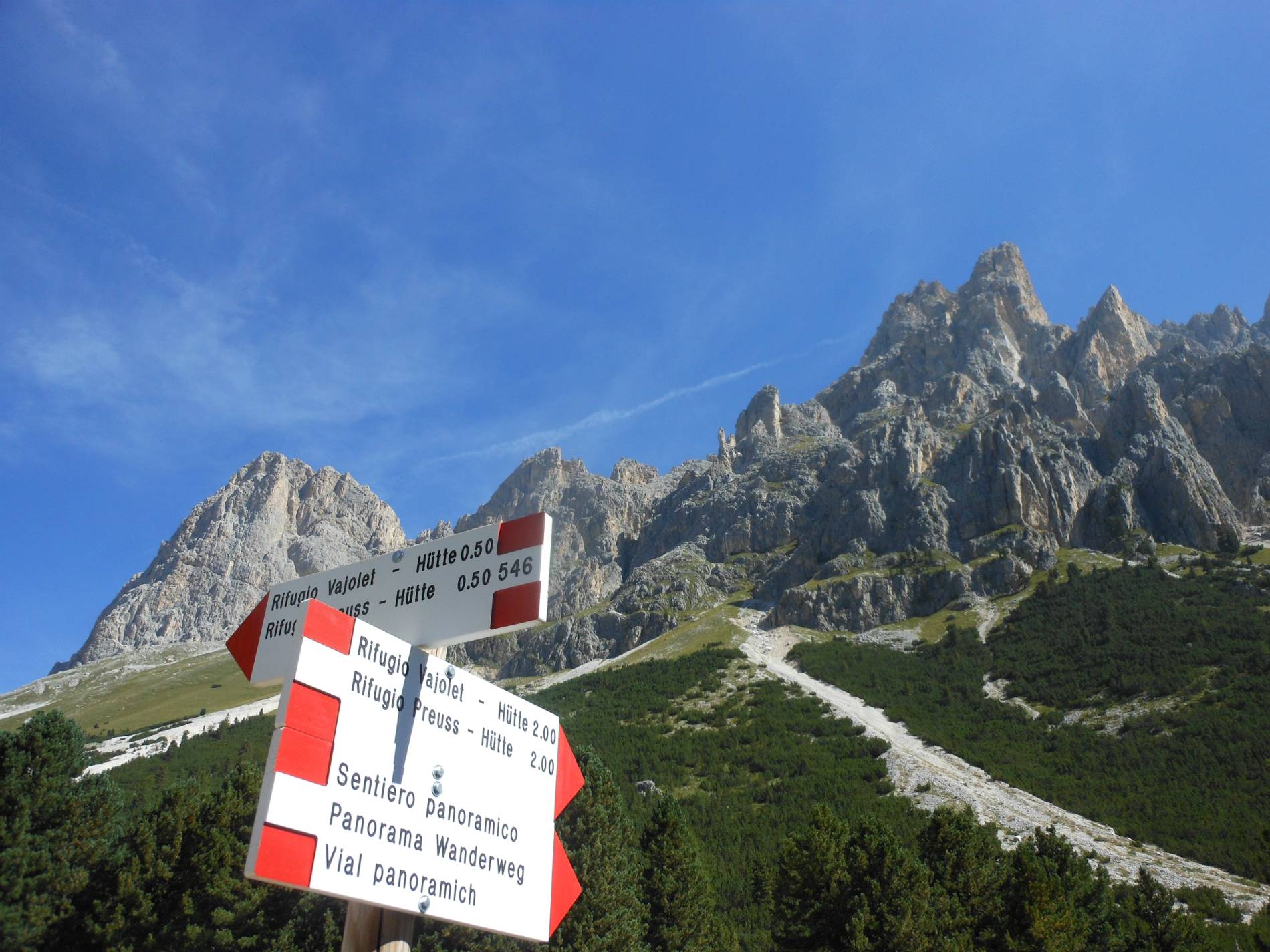 Bellissima escursione di due giorni in compagnia di Sergio, pianificata per fare un grandioso anello. 1°g: Partenza da Gardeccia 1950mt. fino al Rif. Vaiolet e Preuss 2243mt. proseguendo sulla salita fino al Rifugio P.so Principe (Grasleitenhütte) 2600mt. dove pranziamo. Ridiscesi al Rif. Vaiolet saliamo al Rif . Re Alberto (Gartlhütte) 2620mt. e poi fino al Rif.P.so Santner 2734mt. dove facciamo in discesa la Ferrata Santner traversando al Rif. Fronza (Rosengartnerhütte) 2339mt.dove pernottiamo. 2°g: Dal Rif. Fronza (Rosengrtnerhütte) 2339mt. saliamo al P.so di Vaiolon 2560mt. dove attacchiamo la Ferrata Roda di Vael che sale e scende la Roda di Vael 2806mt. fino al Pian del Diaol 2625mt. prendendo poco più sotto la Ferrata Masarè. Finita la ferrata siamo scesi al Rif. Roda di Vael 2280mt. fino a Ciampedie 1997mt. e da li fino al fondo valle a Pera di Fassa dove concludiamo il giro.