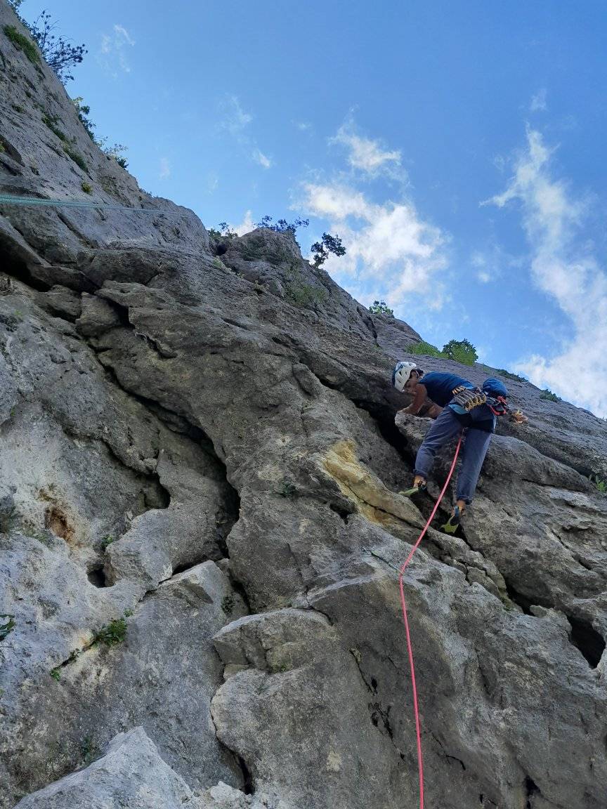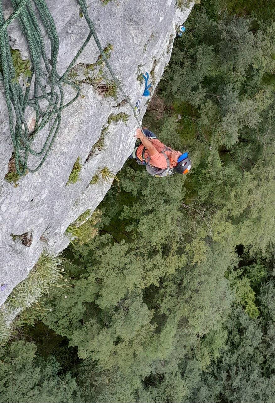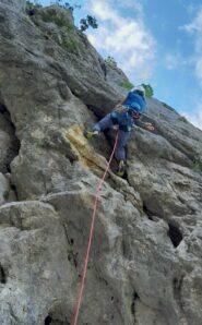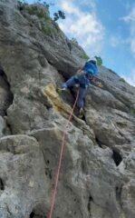 - L4: per parete verticale sopra la sosta e poi leggermente a sx seguendo i cordoni nelle clessidre ultimi 10 mt facili da fare attenzione e con un po’ d’erba che disturba l’arrampicata. 6a – 30m.