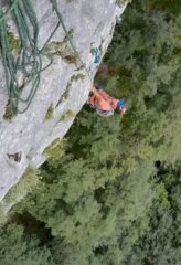 - L6: salire sopra la sosta e seguire i cordoni fino allo strapiombo, seguire la bella fessura soprastante e per parete strapiombante attrezzata a clessidre ribaltarsi in placca fino alla sosta a destra dell’ultimo tratto di “Angeli e Demoni” 30 m. – 6b/c (utili friend per integrare protezioni fisse)