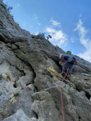 - L3: direttamente sopra la sosta per bella placca verticale che con bei movimenti porta ad aggirare a dx uno spigolo e ancora per placca alla sosta su comodo terrazino. 30 m. – 6b (possibilità di integrare con friend qualche obbligatorio).