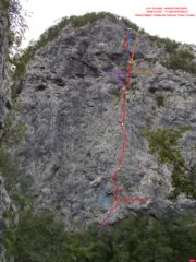 - L2: traversare verso destra a uno spit e seguire le clessidre fino al passo chiave protetto da due fix proseguire in strapiombo ben appigliato protetto da clessidre fino alla sosta. 30 m. – 6c+ , (possibilità di integrare con friend qualche obbligatorio).
