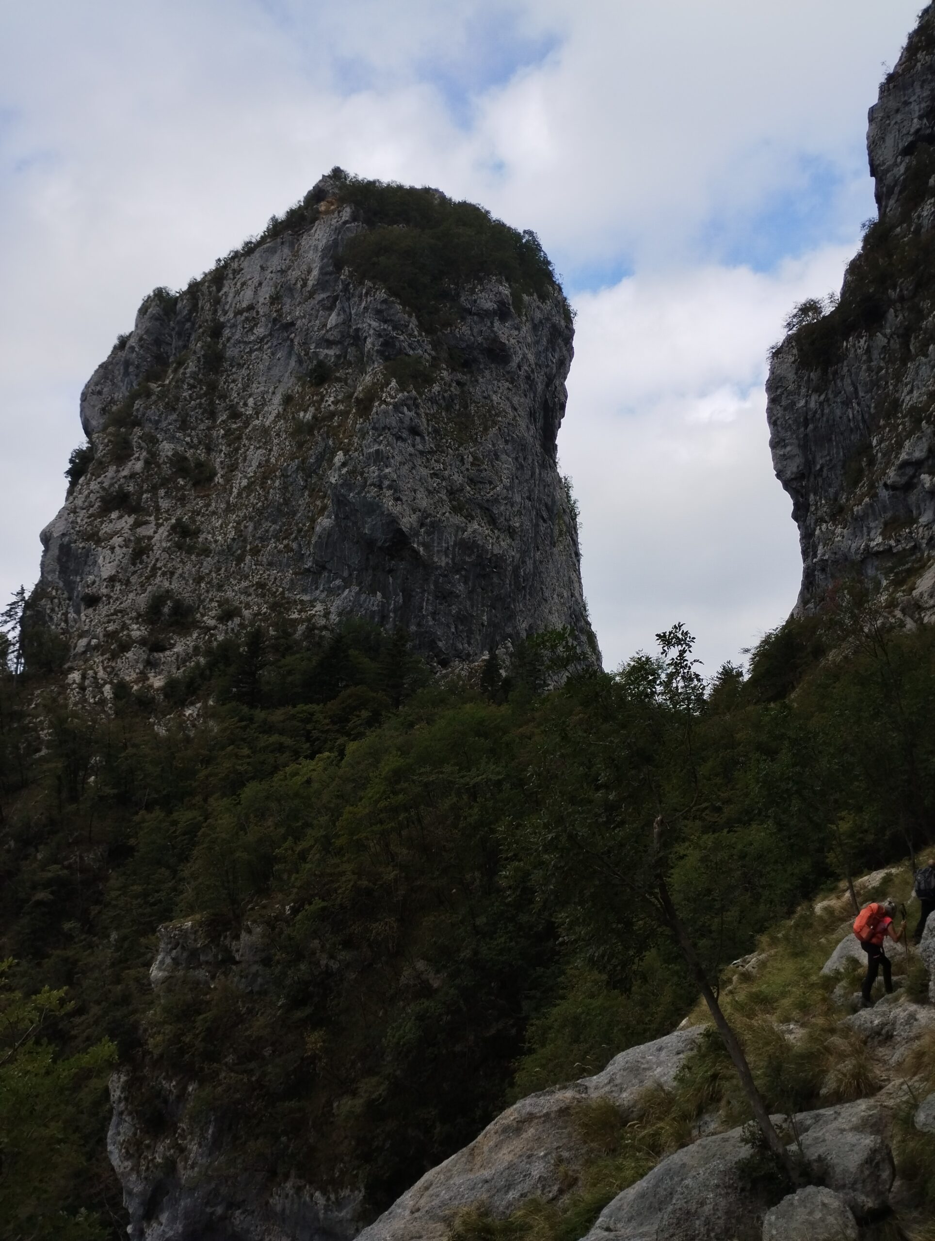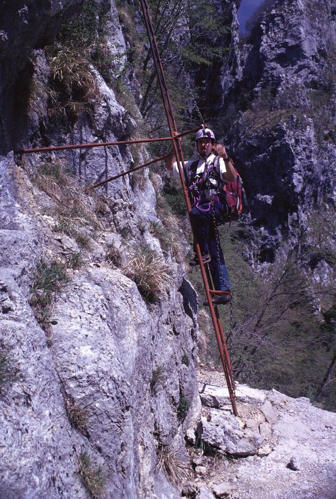 La ferrata ha inizio, si supera la scala quasi verticale, e poi si sale verso destra lungo una rampa rocciosa (corda fissa, catena e pioli metallici) con alcune tacche “scalpellate” nella roccia liscia. Poi ci si sposta gradualmente verso sinistra, superando alcune strette cenge e alcuni gradini rocciosi, si traversa ancora verso sinistra lungo una cengia fino ad entrare nel canale terminale (sempre ben attrezzato) che conduce al boschetto sommitale del nostro torrione (il Giardino).