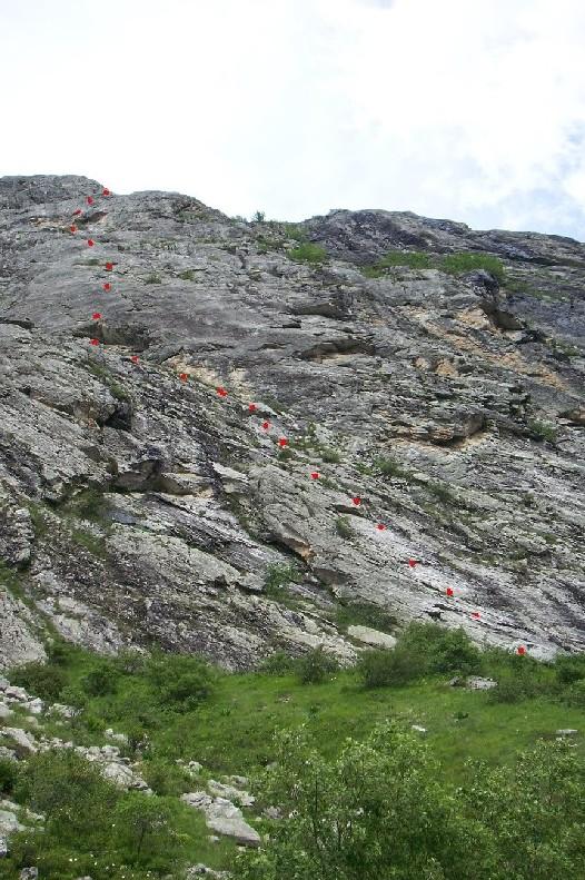 La via è interamente spittata, utile qualche friends. La sesta lunghezza è in comune con la via Suspance