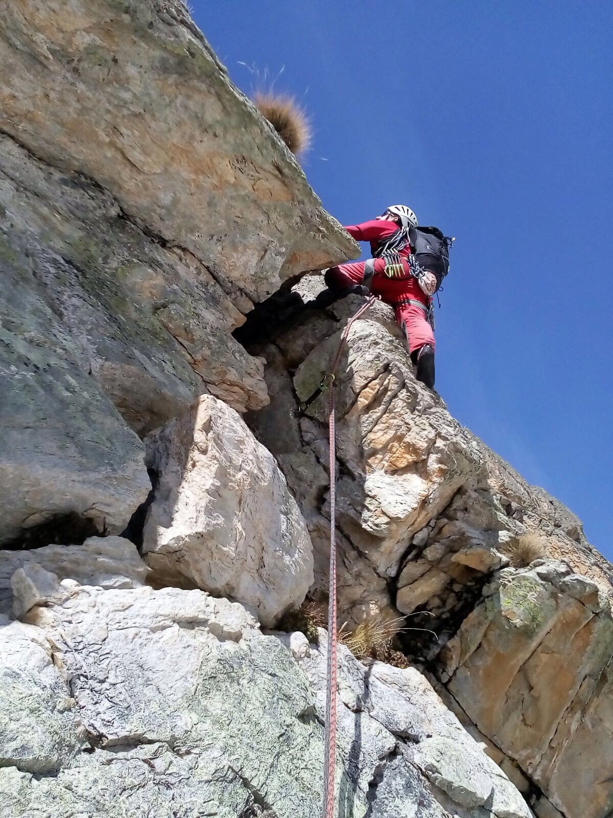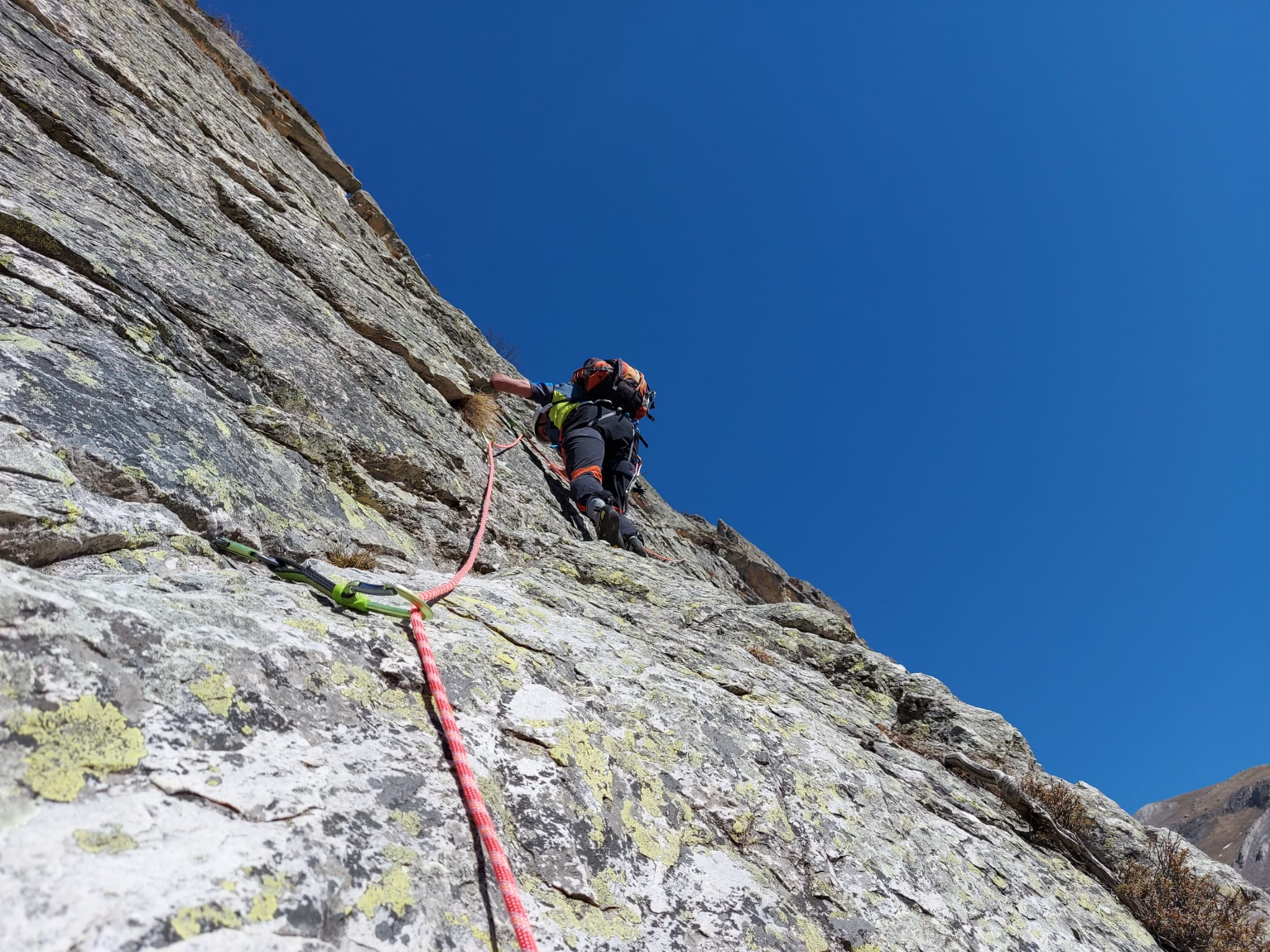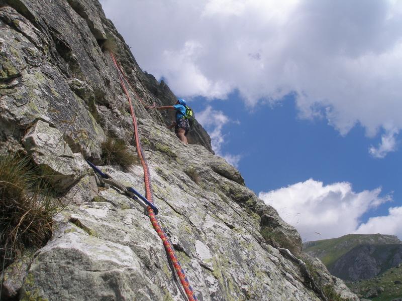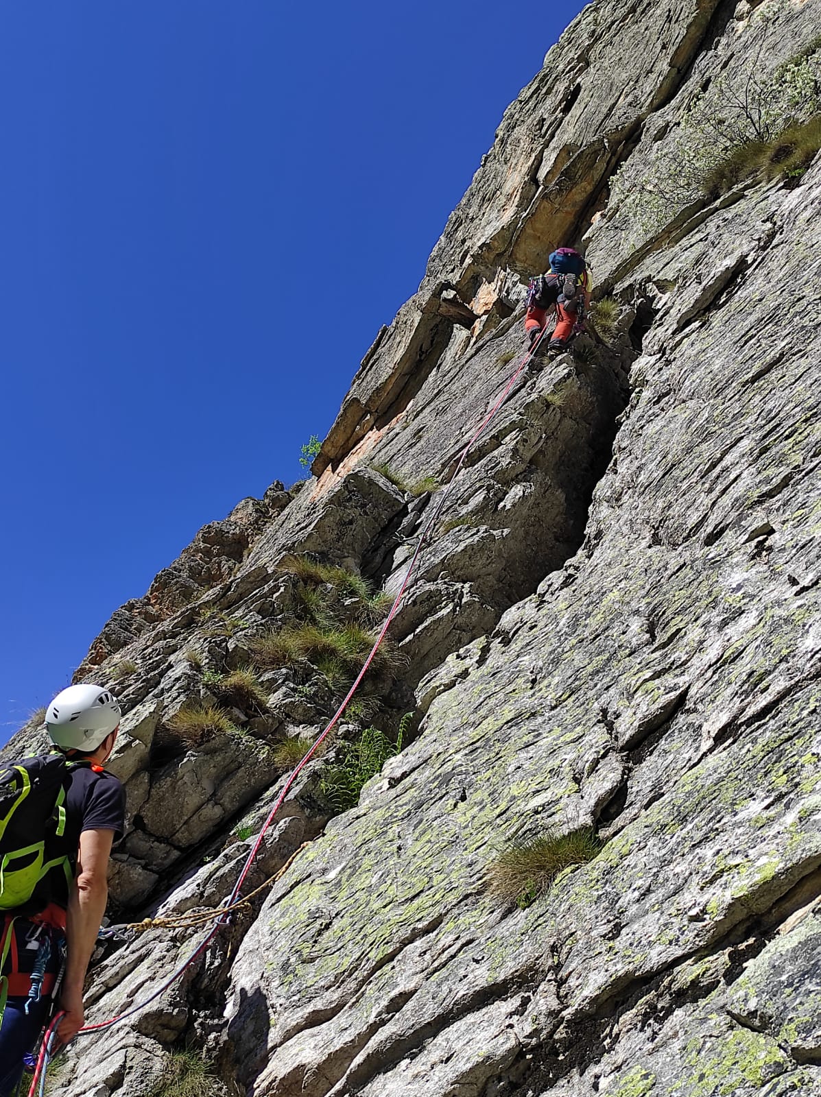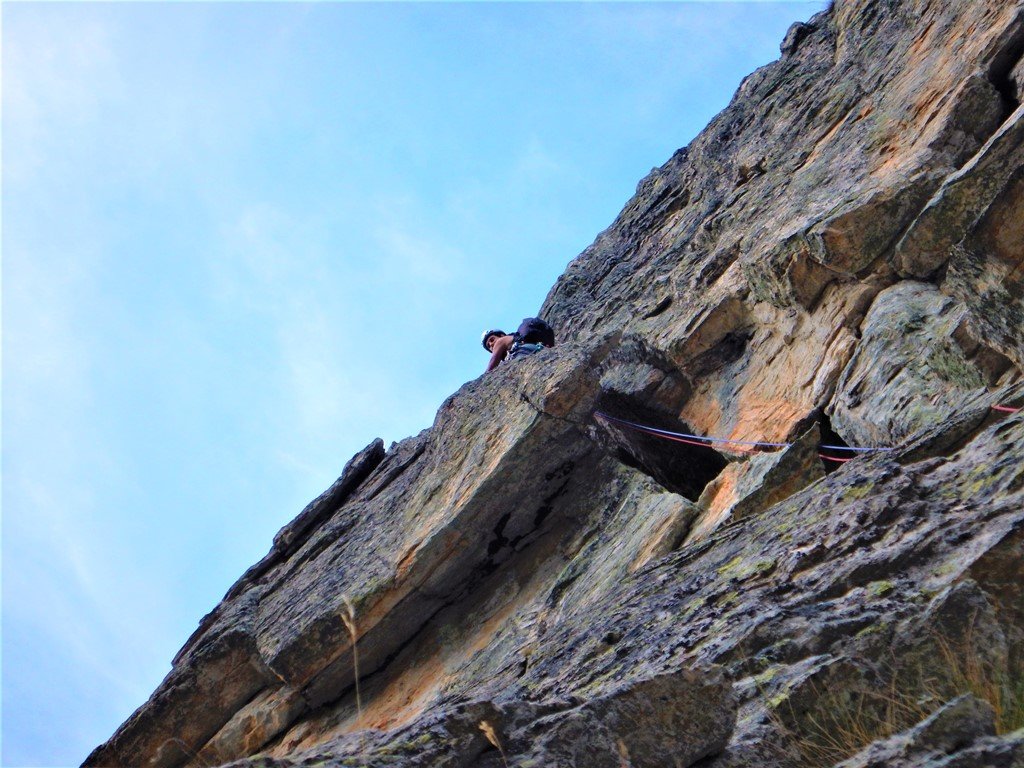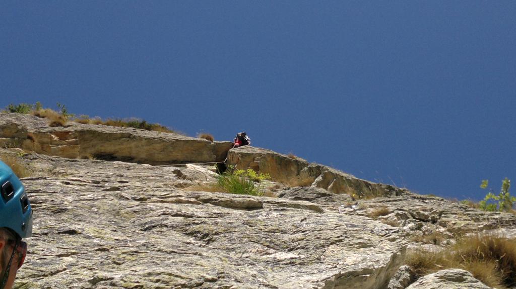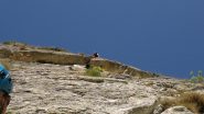 L7 Salire a sinistra dello sperone su placche facili, poco proteggibile, tenendo un po’ la destra si può fare sosta su terrazzo con albero e cordone azzurro. 45 m. II+ e passi di III.