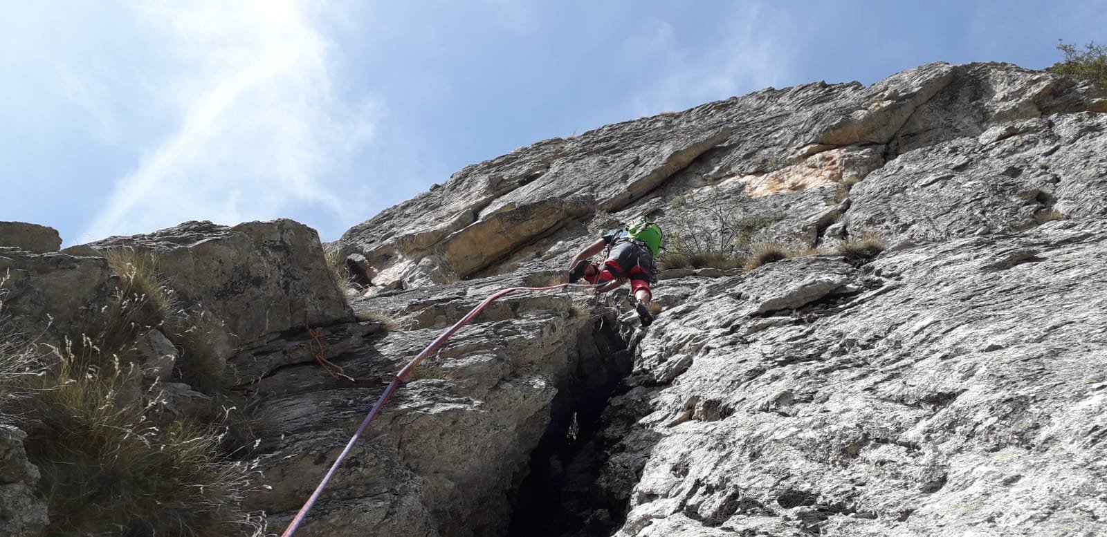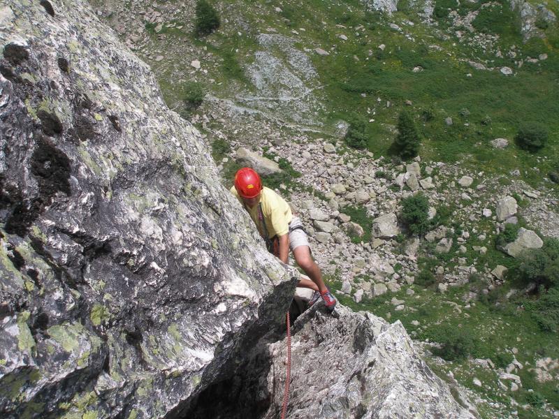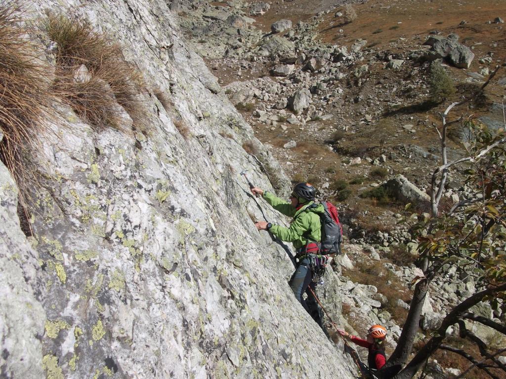 L5 Su in diagonale per la cengia erbosa verso destra e poi su per la placca in prossimità di un alberello. Prima II+ poi passi di III, 1 chiodo e sosta su chiodo e spit, cordone vecchio.