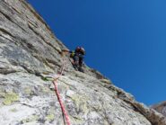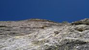 L2 traversare a destra lungo una piccola cengia, guadagnare la fessura e proseguire verticalmente per essa fino a S2, 30 m (IV,III+), 3 chiodi, 1 fix e un friend incastrato, sosta 2 fix con cordone.