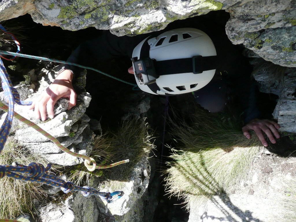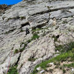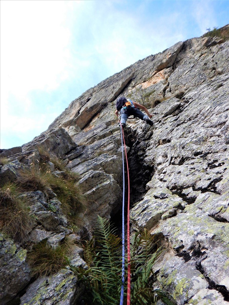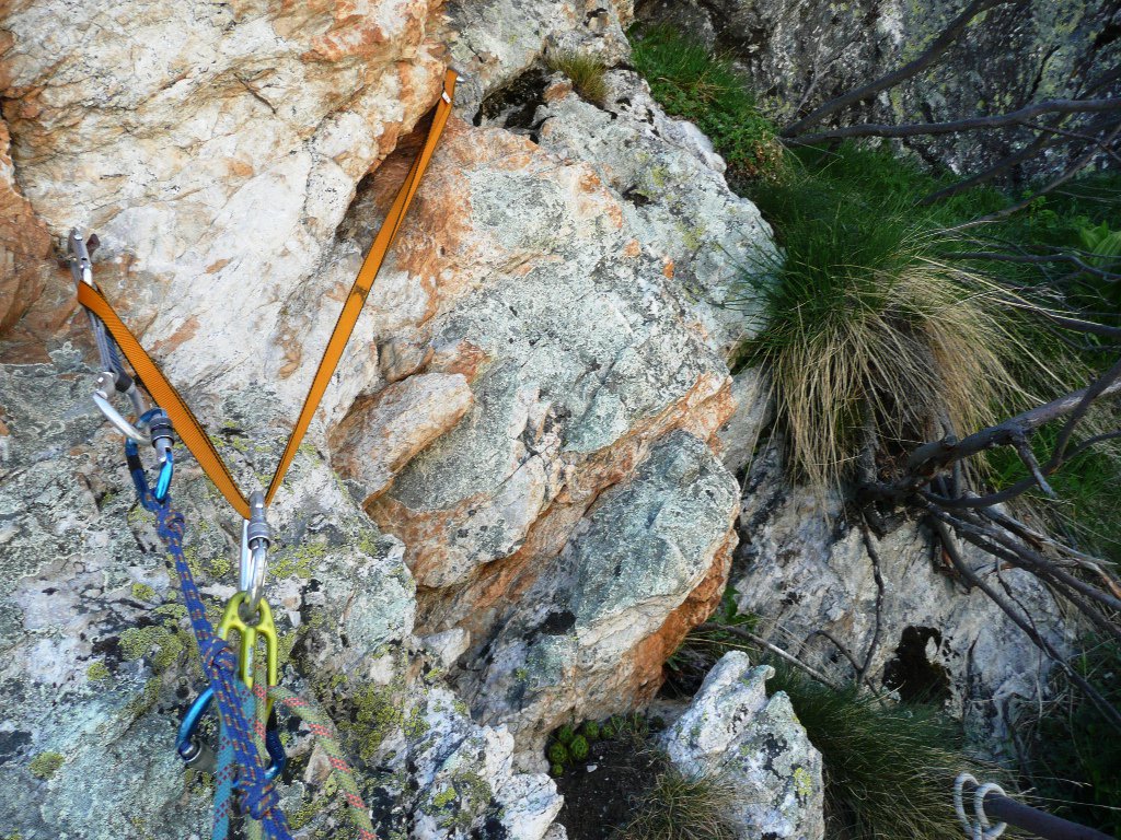 L6 Altro tratto di cengia erbosa da salire fino in fondo dove il prato si allarga, sotto uno sperone ci sono 2 chiodi e 1 fix collegati da cordone per fare sosta, nessun chiodo lungo questo tiro di trasferimento, II.