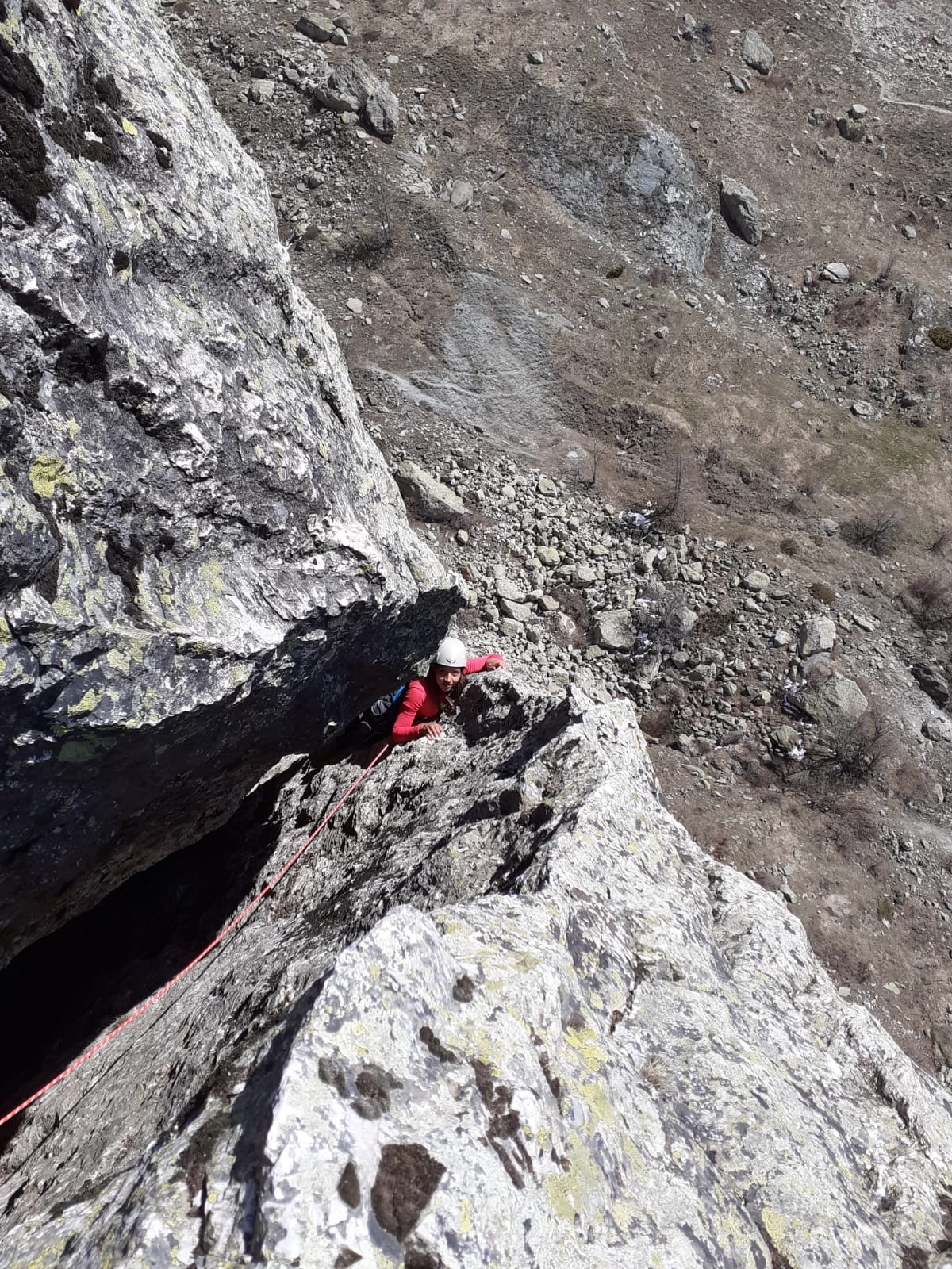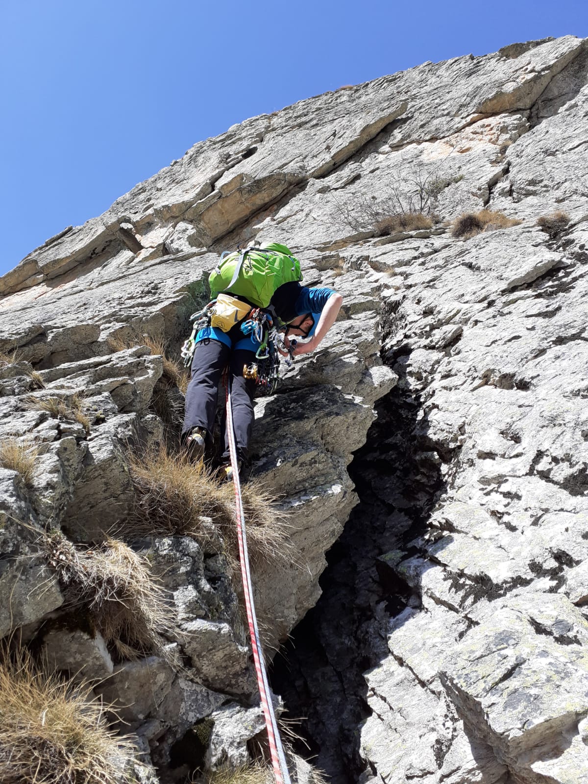 Via non difficile, alcuni chiodi lungo i tiri consigliabile portare un set di friends per integrare. L2 ed L3 i tiri più belli da salire nella fessura. L5 tiro scomodissimo al interno della spaccatura meglio togliere lo zaino e legarlo al imbrago. Seguito relazione di Gambeinspalla (molto precisa) oggi con Piero e Miki